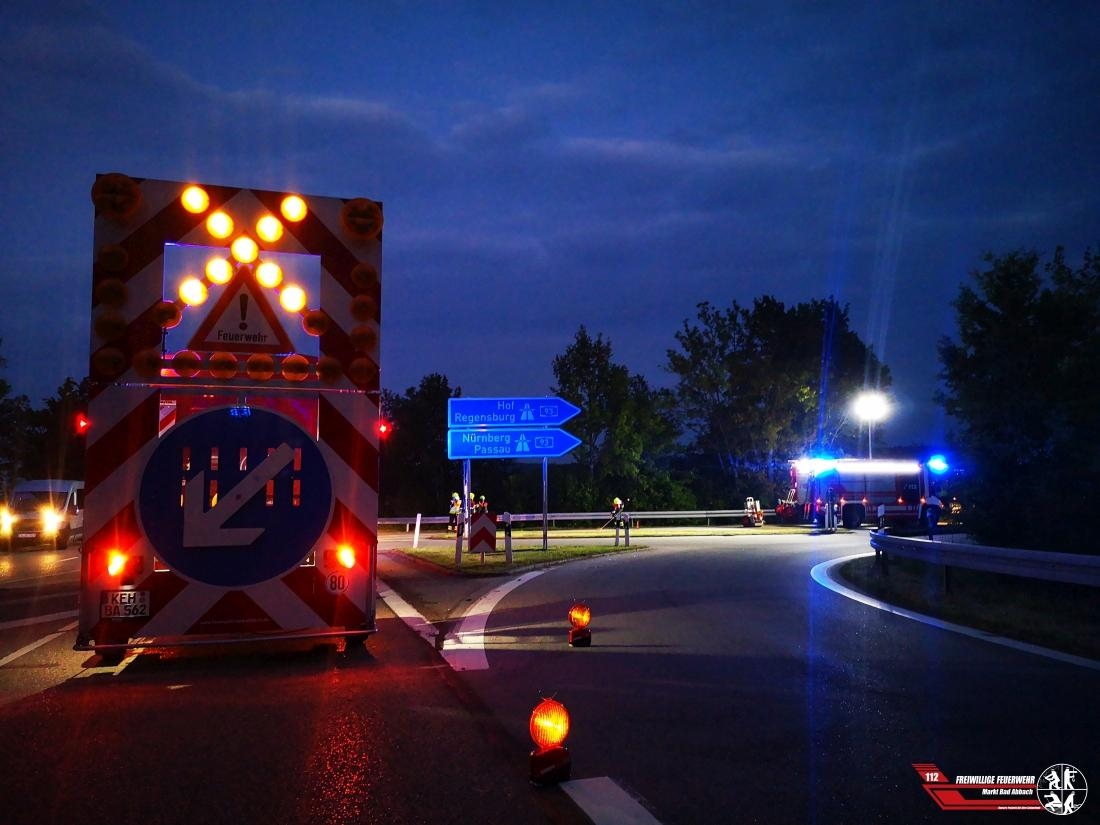 Am heutigen Freitagabend wurden wir gemeinsam mit der Feuerwehr Pentling zu einer Ölspur auf die Autobahn 93 zwischen Bad Abbach und der Raststätte Pentling alarmiert. Es stellte sich jedoch heraus, das sich die Ölspur auf der Staatsstraße 2143 auf der Autobahnbrücke befand. Die Ölspur wurde im Ausfahrtsbereich gereinigt und durch die Straßenbaulastträger eine Ölspur-Warnbeschilderung aufgestellt.