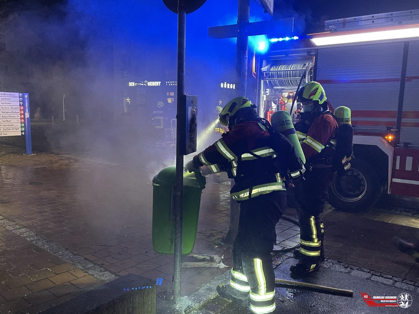 Am frühen Silvesterabend wurden wir zu einem brennenden Mülleimer nähe der Raiffaisenbank alarmiert. Vermutlich durch die unsachgemäße Benutzung von Feuerwerkskörpern entfachten die Abfallreste im Mülleimer, dieser wurde mittels Schnellangriffschlauch aus dem HLF abgelöscht.