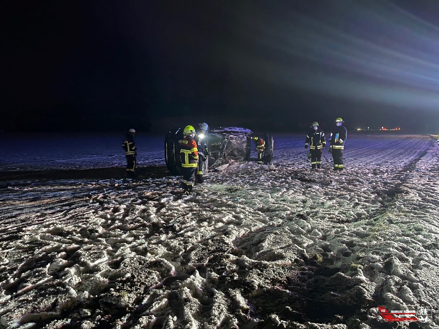 Vermutlich aufgrund Schneeglätte kam ein alleinbeteiligter Pkw der Marke Audi von der Fahrbahn ab und seitlich im angrenzenden Feld zum Liegen. Die Person konnte sich selbst befreien und wurde von mitalarmierten Rettungsdienst versorgt.