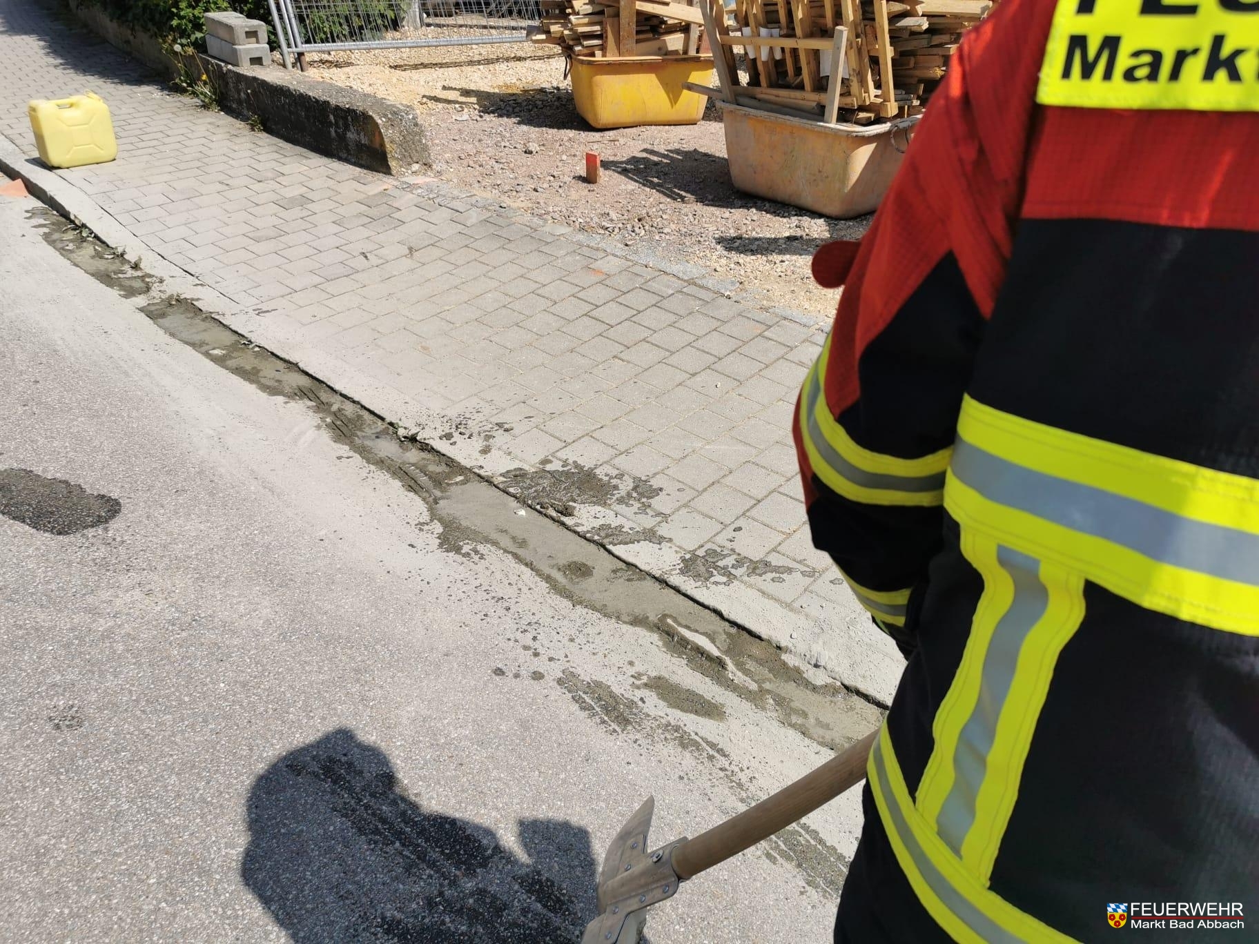 Aufgrund eines Defekts verlor ein Lkw mit Ladekran größere Mengen an Hydrauliköl. Da der Versuch des Verursachers, das Hydrauliköl mit Zement zu beseitigen, fehlschlug, wurde die Verschmutzung durch uns zusammen mit der Kehrmaschine des Bauhofs beseitigt.
