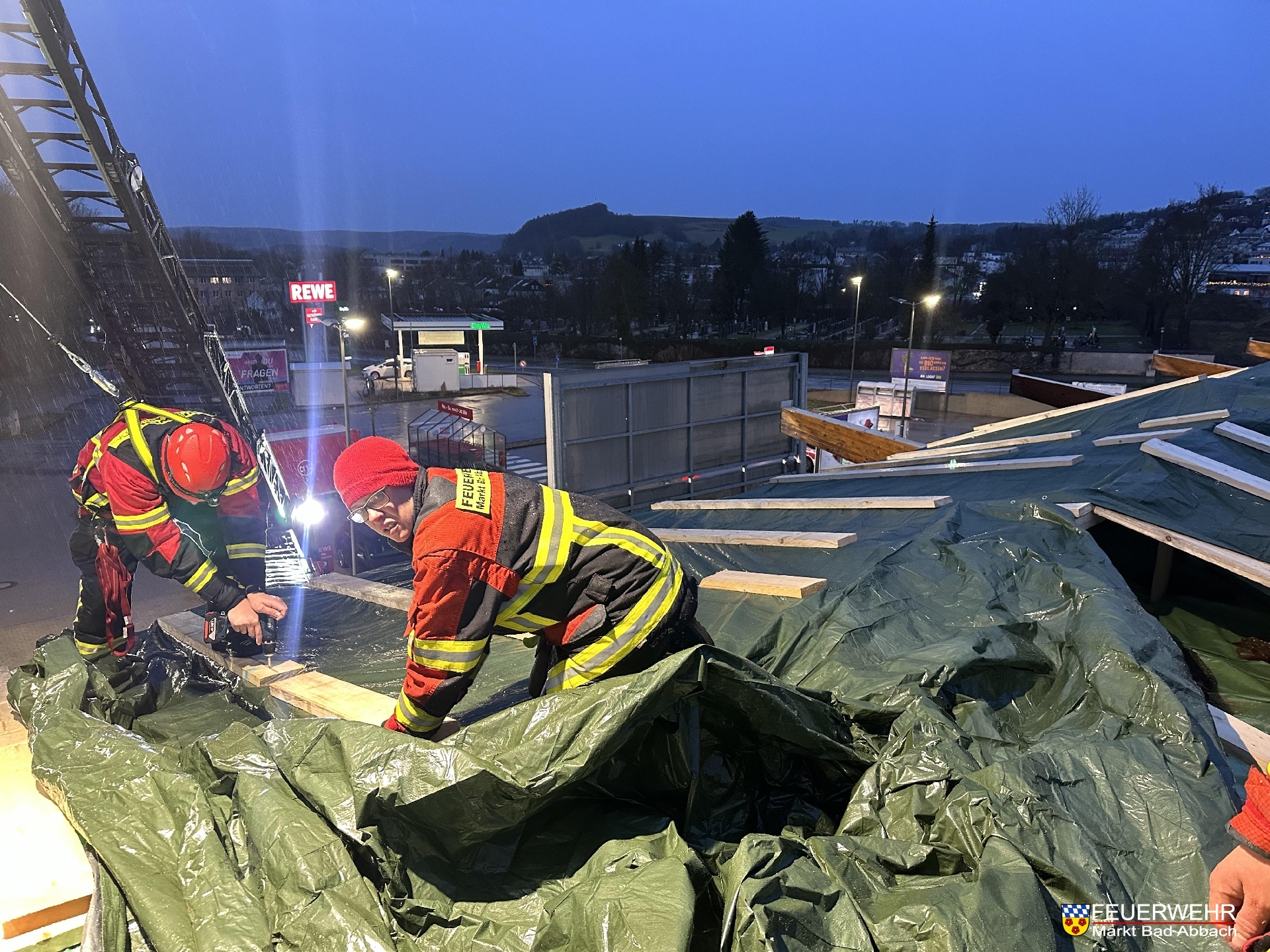 Um 10:50 Uhr wurden wir erneut zum REWE Verbrauchermarkt in die Finkenstraße gerufen. Der Dauerregen der vergangenen Stunden drang trotz dem provisorischen Dach vom 23. Dezember in das Objekt ein.
