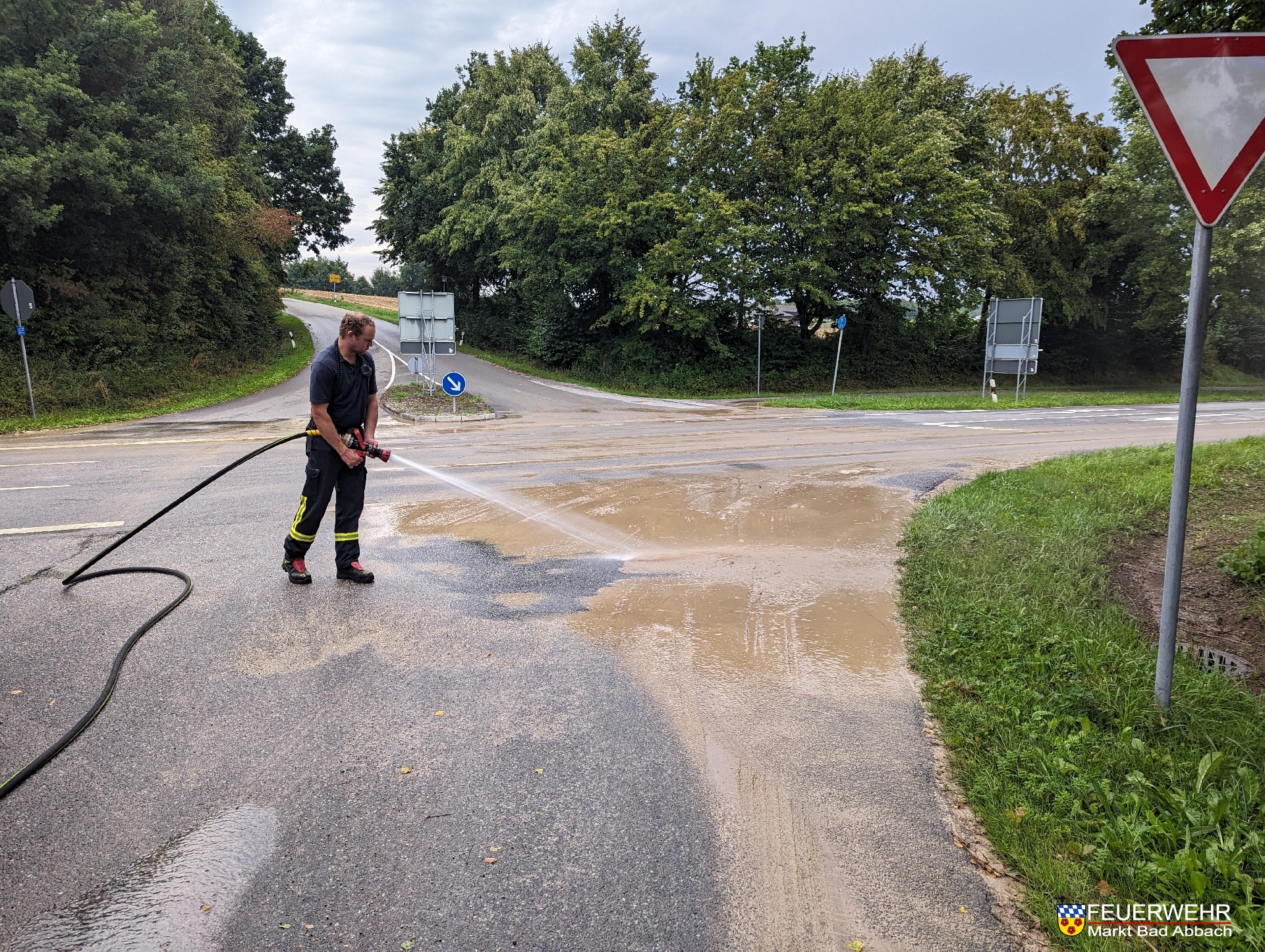 Ausgehend von einem Acker, überflutete ein Starkregenereignis die Stinkelbrunnstraße im Kreuzungsbereich am Tunnelportal mit Schlamm und Geröll. Die Fahrbahn wurde gereinigt.