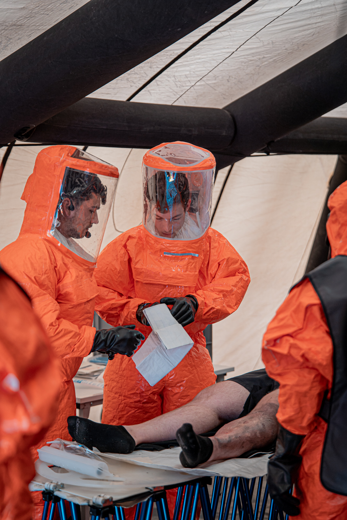 Im Rahmen der Gefahrenabwehr bei chemischen, biologischen und radiologischen Kontaminationen kann diese Ausstattung zur Entgiftung,