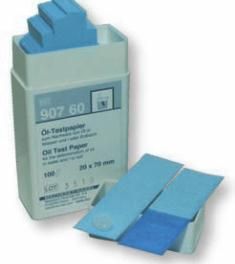 Das Öltestpapier ist ein Indikatorpapier zum schnellen, qualitativen Nachweis von Kohlenwasserstoffen wie Petrolether, Benzin, Heizöl, Schmieröl, Mineralöl und Erdöl in Wasser oder Erdreich. Des Weiteren eignet sich das Öltestpapier zum Schnell-Nachweis von Dieselkraftstoff in AdBlue-Tanks. Die Schnell-Teststreifen bestehen hauptsächlich aus mikrokristalliner Cellulose. Die Funktionsweise basiert auf der Benetzung des Papiers und der Cellulose mit dem Öl, wodurch es zu einem optisch homogenen und damit durchsichtigen Bereich aufgrund des ähnlichen Brechungsindexes der beiden Stoffe kommt, und der tiefblaue Papieruntergrund sichtbar wird. Mit dem Öl-Testpapier lassen sich Öl-Kontaminationen von Wasser oder Erdreich schnell und einfach erkennen. Die Empfindlichkeit des Testpapieres ist in starkem Maße abhängig von der Löslichkeit bzw. der Dispergierbarkeit der Kohlenwasserstoffe. Zum Nachweis von Öl in Erdreich drückt man das Papier fest gegen die zu prüfende Bodenprobe und spült anschließend – falls erforderlich – mit klarem Wasser ab. Die Farbreaktion des Testpapiers muss bei leicht flüchtigen Substanzen sofort beurteilt werden. Zum Nachweis von Öl in Wasser schwenkt man das Testpapier an der Wasseroberfläche mehrmals hin und her.