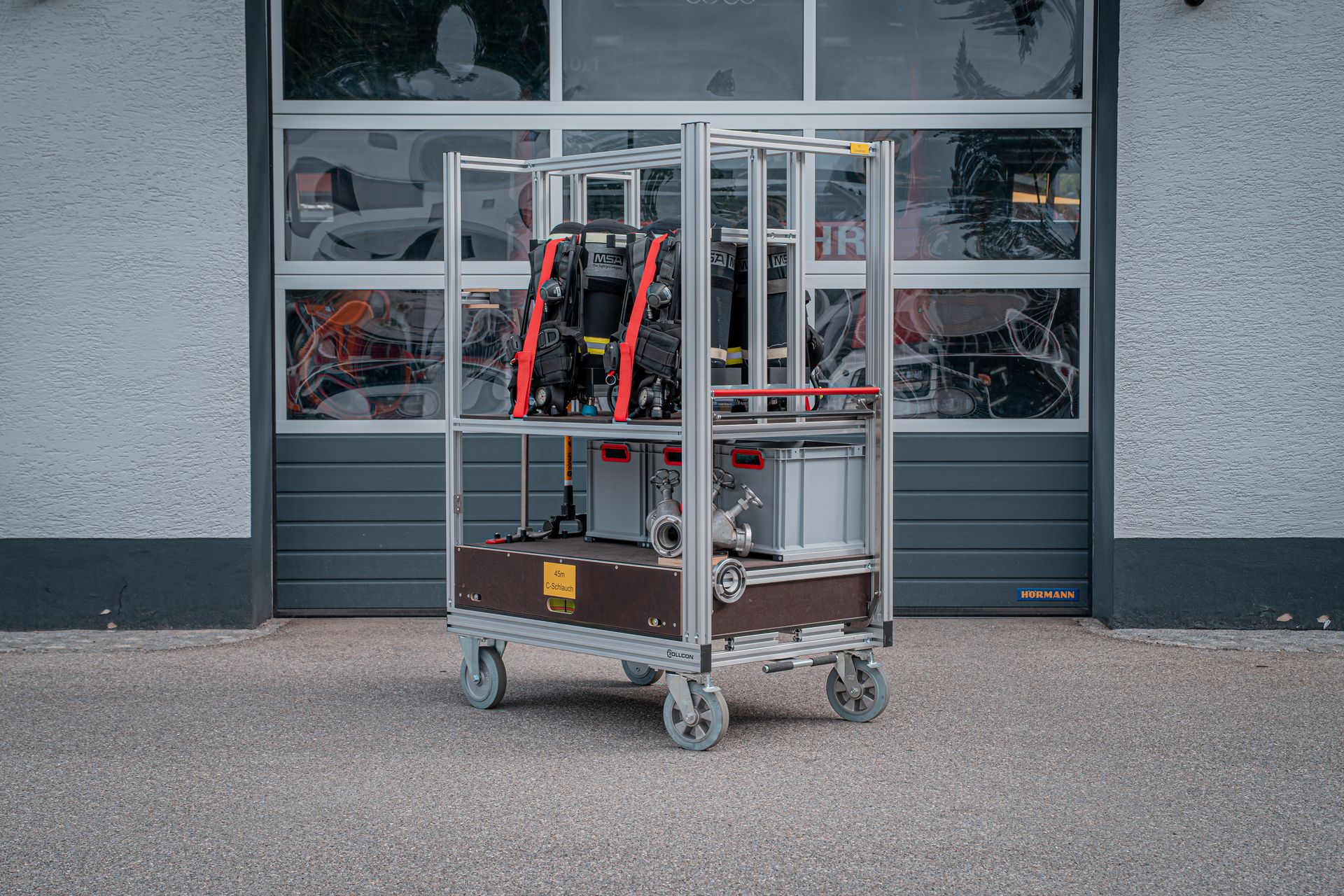 Eigens für unseren Straßentunnel wurde im Jahr 2022 ein Rollcontainer Atemschutz angeschafft. Bei einem Brandfall rüsten sich Atemschutzträger mit den vier Langzeit Pressluftatmern aus und führen diesen anschließend mit in die Röhre. Neben einem 45m C-Schlauch befinden sich weitere Hilfmsittel, Armaturen und Werkzeuge auf diesem Container.