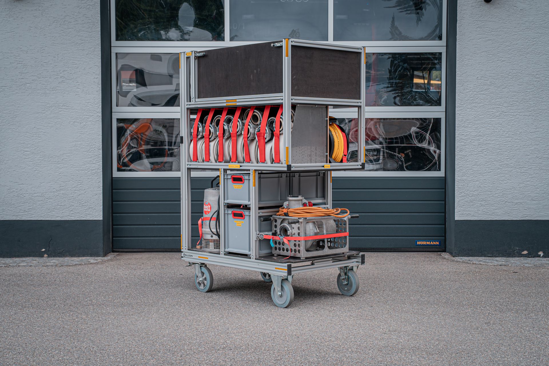 Mit den zwei am Standort befindlichen Rollcontainer Schlauch (á 500m B Druckschlauch) können lange Schlauchstrecken wie zum Beispiel Straßentunnel, abschüssige Objekte oder Wald und Wiesenwege verlegt werden. Im Einsatzfall können diese auf unseren V-LKW verlastet werden und so in Schrittgeschwindigkeit vom Fahrzeug aus verlegt werden. Zusätzlich führen diese Container Schlauchbrücken und einen Schlauchaufroller mit.