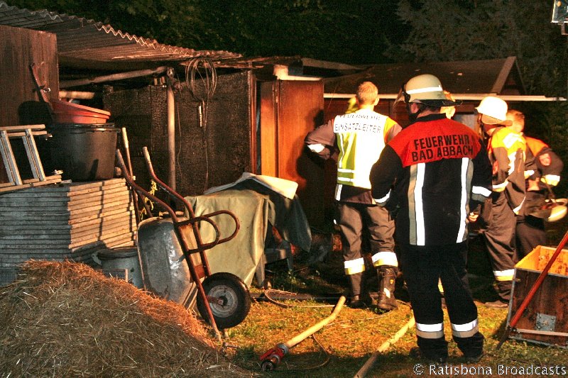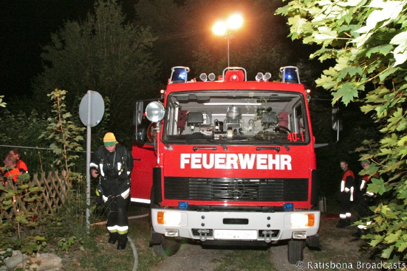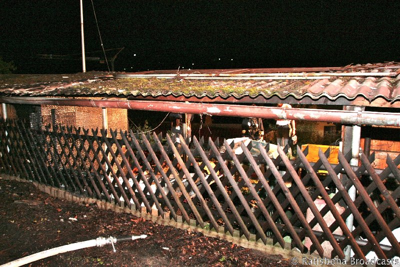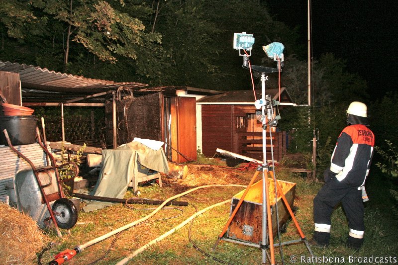 Gegen 0 Uhr ging erneut ein Notruf über eine brennende Holzhütte in der Römerstraße ein. Der Brand wurde durch mehrere Anrufe bestätigt. Die Einsatzleitung veranlasste daraufhin sofort einen Vollalarm für die Einsatzmannschaft unserer Wehr, sowie eine Alarmierung weitere Kräfte aus den Ortsteilen Lengfeld und Peising. Die Feuerwehr Pentling unterstützte mit Atemschutzgeräteträgern. Die ca. 10 qm große Hütte brannte in voller Ausdehnung. Schnell konnte die Lage unter Kontrolle gebracht und "Feuer aus" gemeldet werden.