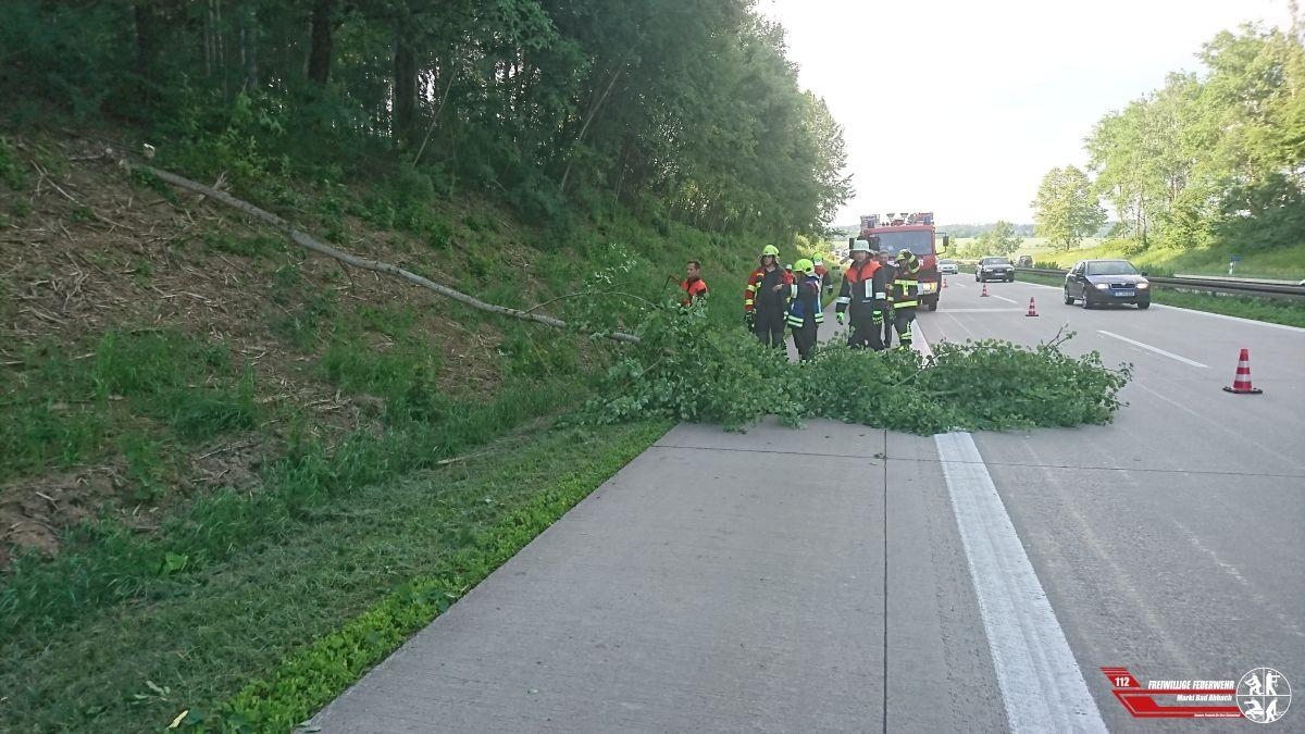 Gegen 18 Uhr wurden wir zu einem Folgeeinsatz auf die Bundesautobahn 93 zwischen der Anschlussstelle Bad Abbach und dem Dreieck Saalhaupt zu einem Baum auf der Fahrbahn alarmiert. Ein größerer Baum und deren Äste ragten in die Fahrbahn. Das Hindernis wurde binnen kürzester Zeit mittels einer Motorsäge entfernt.