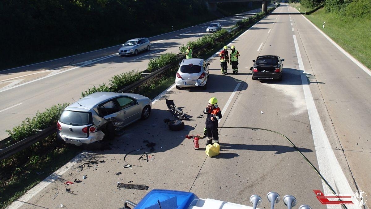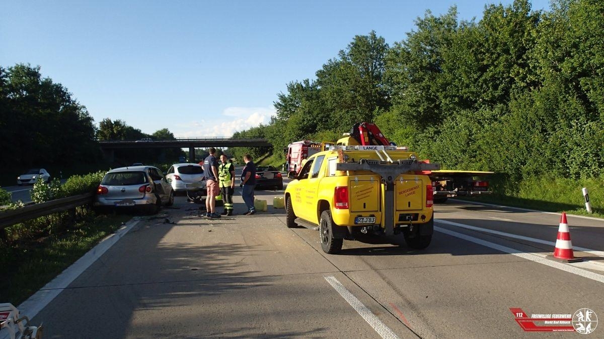 Zu einem Verkehrsunfall mit mehreren Pkw wurden wir auf die Autobahn 93 Fahrtrichtung Regensburg gegen 17:30 Uhr alarmiert. Der Einsatzleiter meldete zügig eine Lage, fünf Pkw waren an dem Unfall beteiligt, vier Pkw waren daraufhin nicht mehr fahrbereit und teils schwer beschädigt. Vier Personen wurden bei dem Unfall verletzt und durch mehrere Rettungswägen in umliegende Krankenhäuser verbracht. Die Unfallaufnahme der Polizei zog sich aufgrund der größeren Unfallstelle längere Zeit hin. Als diese beendet war, konnten die Fahrzeuge auf mehrere Abschleppwägen verlastet werden. Die Autobahn war für den kompletten Zeitraum komplett gesperrt, die Feuerwehr Teugn wurde nachalarmiert zum Ausleiten an der Anschlussstelle Bad Abbach.