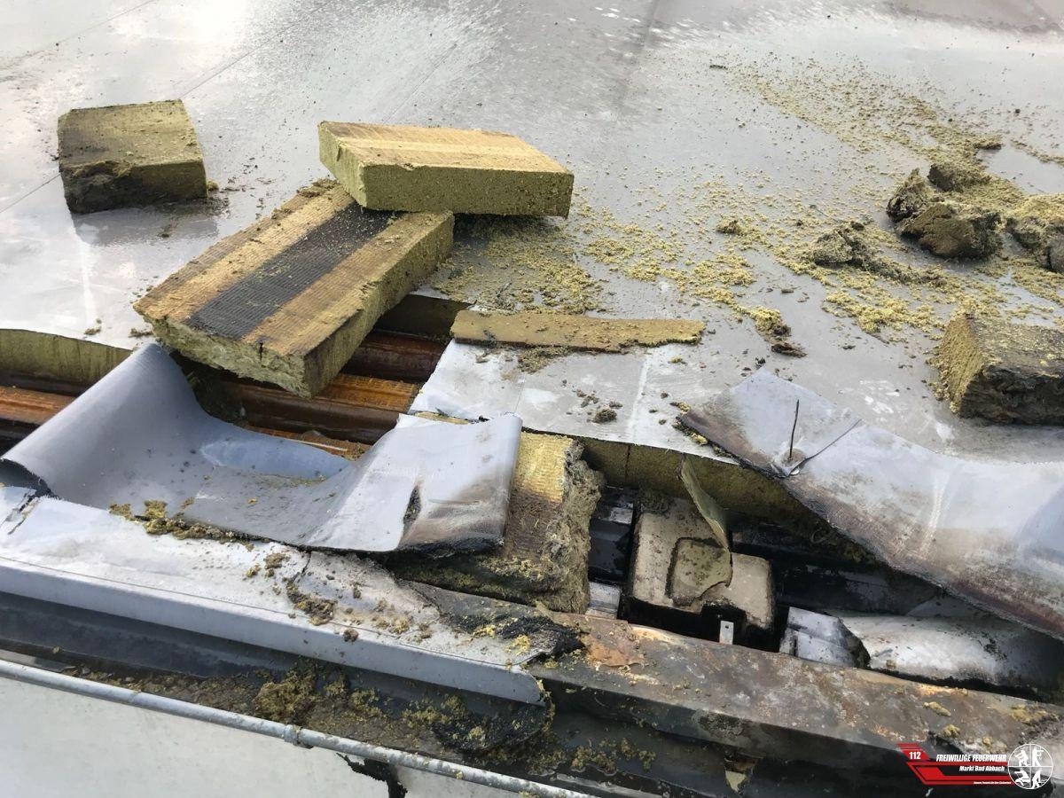Die Einsatzleitung entschied nach einer detailierten Lagefeststellung das Dach in verschiedenen in der Wärmebildkamera auffälligen Bereichen zu öffnen. Mittels einer Blech-Motorsäge öffneten wir Teile der Dachhaut um gezielt den Brand bekämpfen zu können. Die Kameraden aus Kelheim unterstützten hierbei. Die restlichen Wehren stellten die Wasserversorgung von einem nahegelegenen Löschteich sicher.