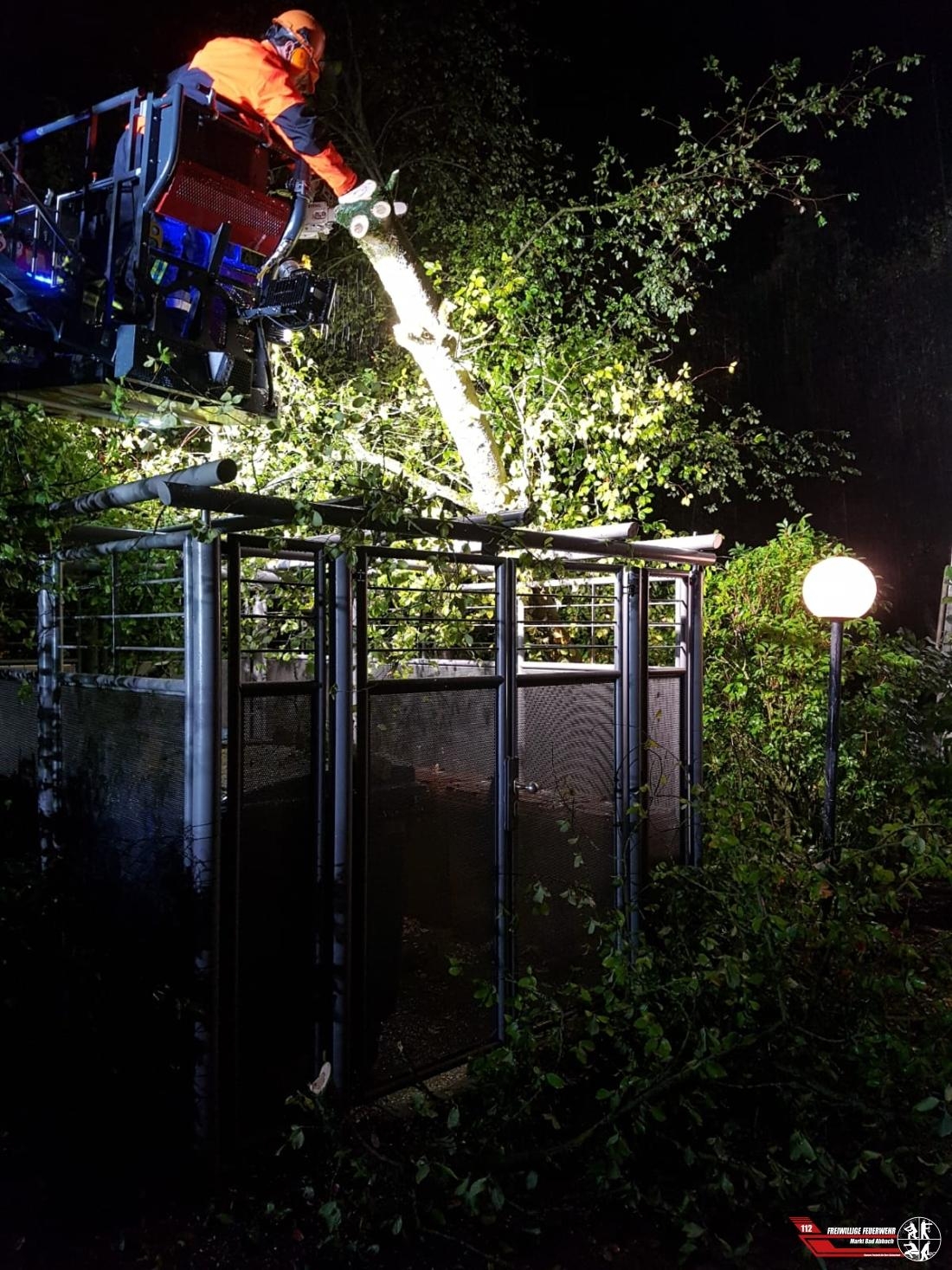 Es musste ein auf ein Gebäude gestürzter Baum mittels der Drehleiter beseitigt werden.