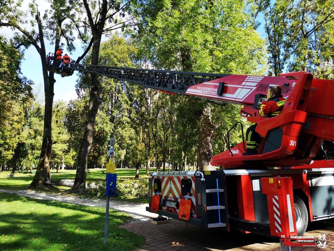 Erneut musste für den örtlichen Bauhof ein größerer abgerissener Ast von einer Baumgabelung in etwa 15 Meter Höhe mittels der Drehleiter entfernt werden.