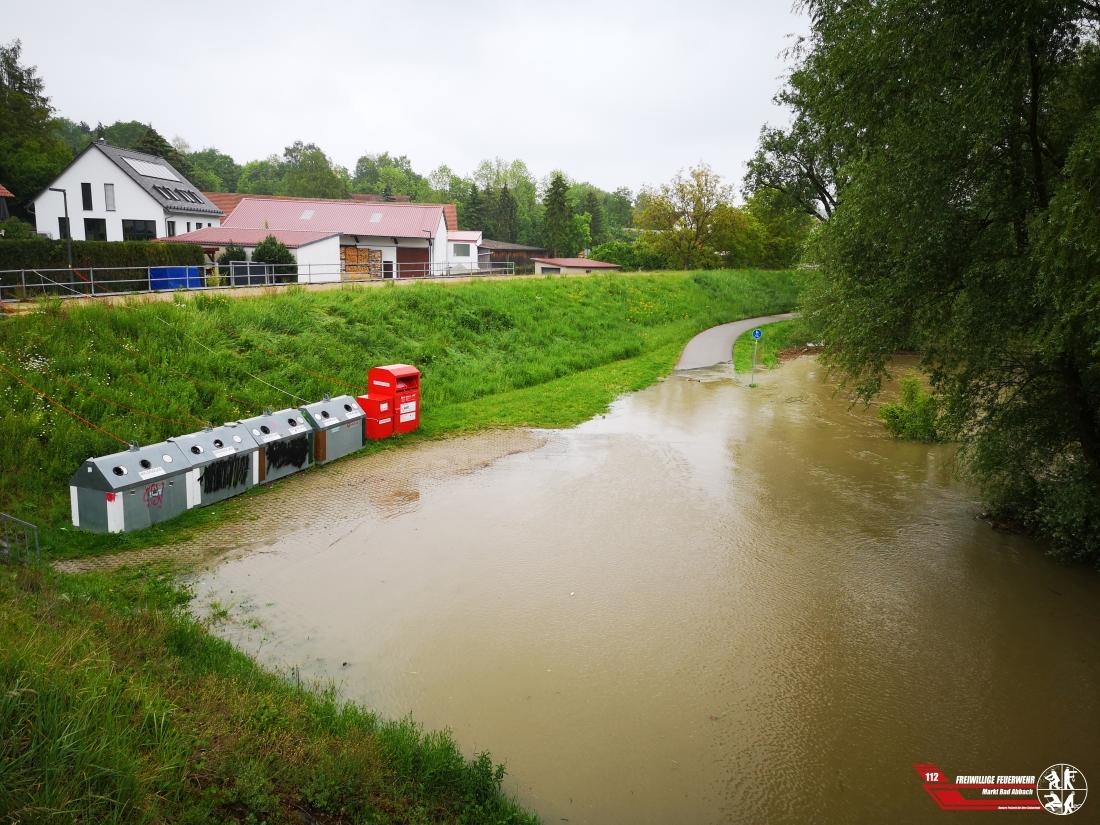 Aufgrund des steigenden Pegels wurden mehrere Altglas- und Kleidercontainer im Bereich des Parkplatzes unter der Fußgängerbrücke mittels Arbeitsleinen gesichert und der Bereich abgesperrt.
