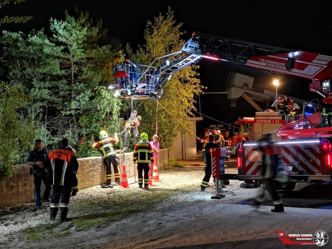Gegen 21:30 Uhr alarmierte die Integrierte Leitstelle Landshut die Feuerwehren Poikam und Lengfeld mit dem Stichwort "Tierrettung, Hund fünf Meter abgestürzt" in die Kiesgrube nach Poikam. Ein Hund ist aus bisher ungeklärter Ursache einen circa 10 Meter tiefen Abgrund abgestürzt. Nach der ersten Erkundung durch den örtlich zuständigen Einsatzleiter wurde umgehend weiteres Gerät, unter anderem unsere Drehleiter nachalarmiert. Nachdem durch die Feuerwehren die Einsatzstelle ausgiebig ausgeleuchtet wurde, kam mit Hilfe unseres Hubrettungsgerätes der Gerätesatz Absturzsicherung zum Einsatz. Anschließend konnte ein Kamerad über einen Schacht sich Zugang zu dem Besitzer und dem verletzten Hund verschaffen. Das verletzte Tier wurde mittels Rettungsdreieck und die Hundeführerin mittels Brust-Sitzgurtkombination aus der Tiefe erfolgreich gerettet. Der Hund kam zur medizinischen Abklärung in eine Tierklinik.