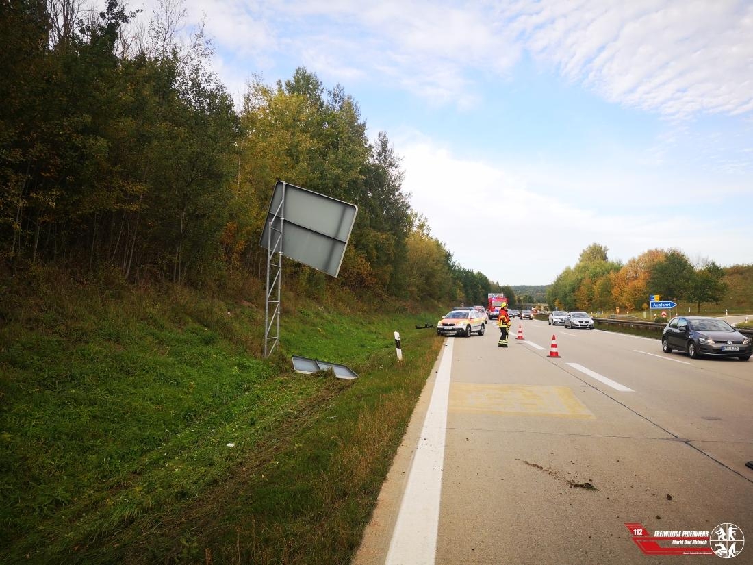 Um 16:09 Uhr wurden wir mit dem Stichwort "Verkehrsunfall mit Pkw" auf die Autobahn 93 alarmiert. Ein Fahrzeug der Marke Audi kam aus bisher unegklärter Ursache von der Fahrbahn ab, prallte gegen ein Verkehrsschild und kam letzlich kurz vor der Anschlussstelle Hausen im Graben zum liegen. Wir übernahmen Verkehrslenkende Maßnahmen stellten den Brandschutz sicher und reinigten die Fahrbahn. Eine Person wurde bei diesem Unfall verletzt.