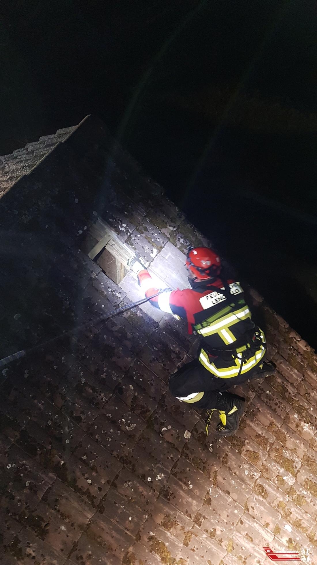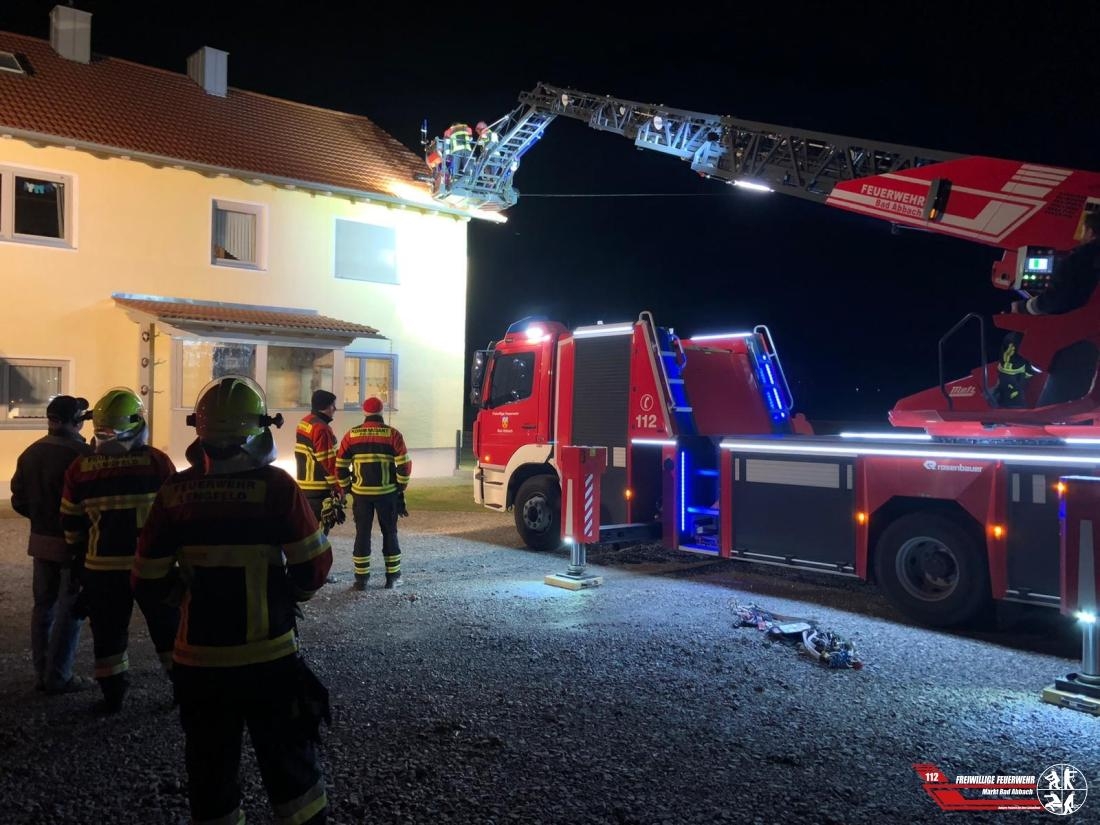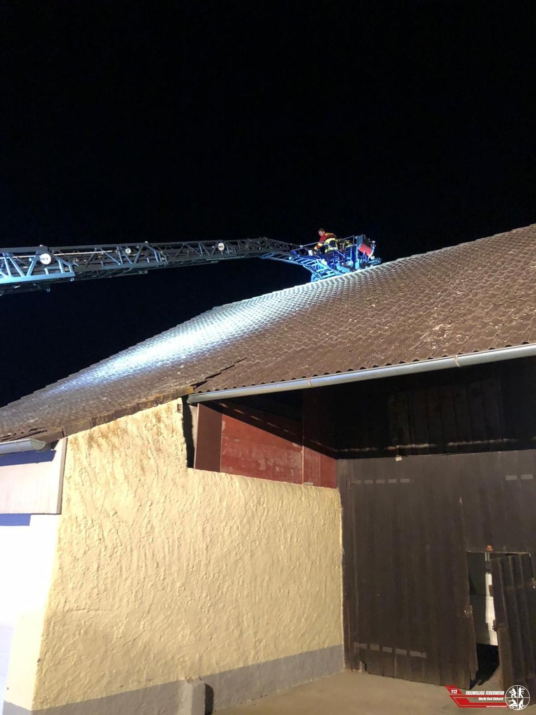 Die Feuerwehr Lengfeld forderte unsere Drehleiter mit Personal der Fachgruppe Absturzsicherung an, da an einem Anwesen in Alkofen von zwei Gebäude einige Dachziegel vom Dach geweht wurden.
