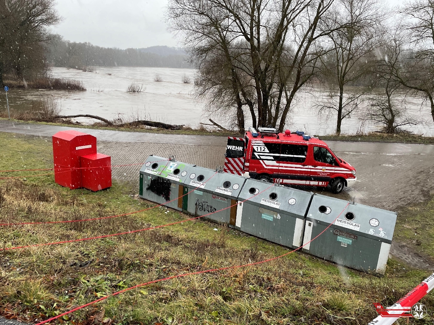 Aufgrund des steigenden Pegels wurden mehrere Altglas- und Kleidercontainer im Bereich des Parkplatzes unter der Fußgängerbrücke mittels Arbeitsleinen gesichert und der Bereich abgesperrt. Außerdem wurde durch den örtlichen Bauhof der Parkplatz gesperrt.