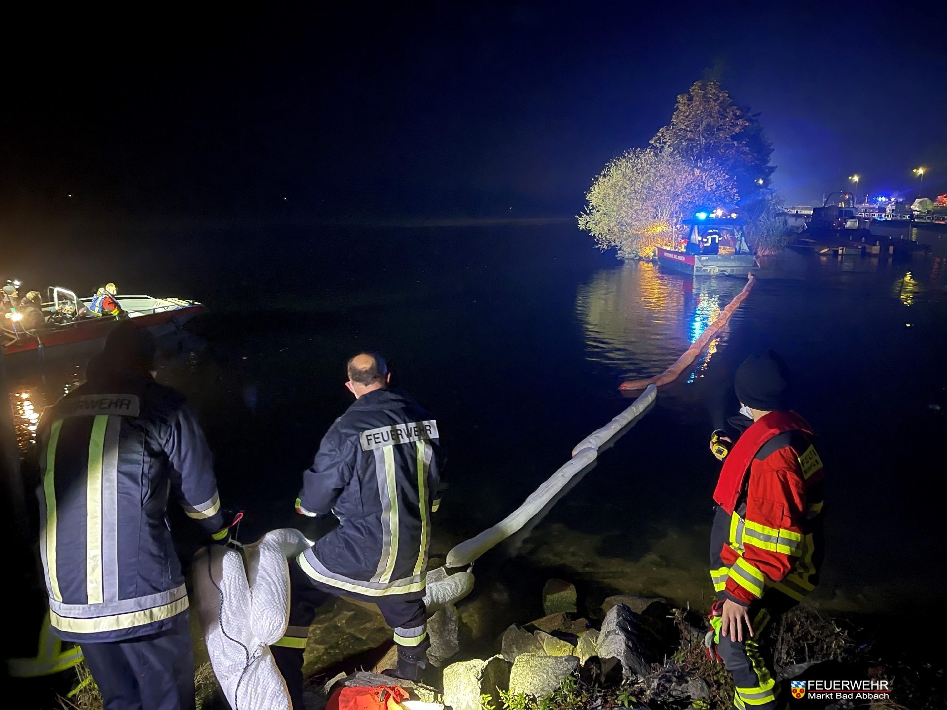 Nach Abstimmung mit dem Wasserwirtschaftsamt wurde unter Einsatz des Mehrzweckbootes eine Ölsperre im Bereich der Hafeneinfahrt eingezogen, um ein Eindringen des Kraftstoffes in die Donau zu verhindern.