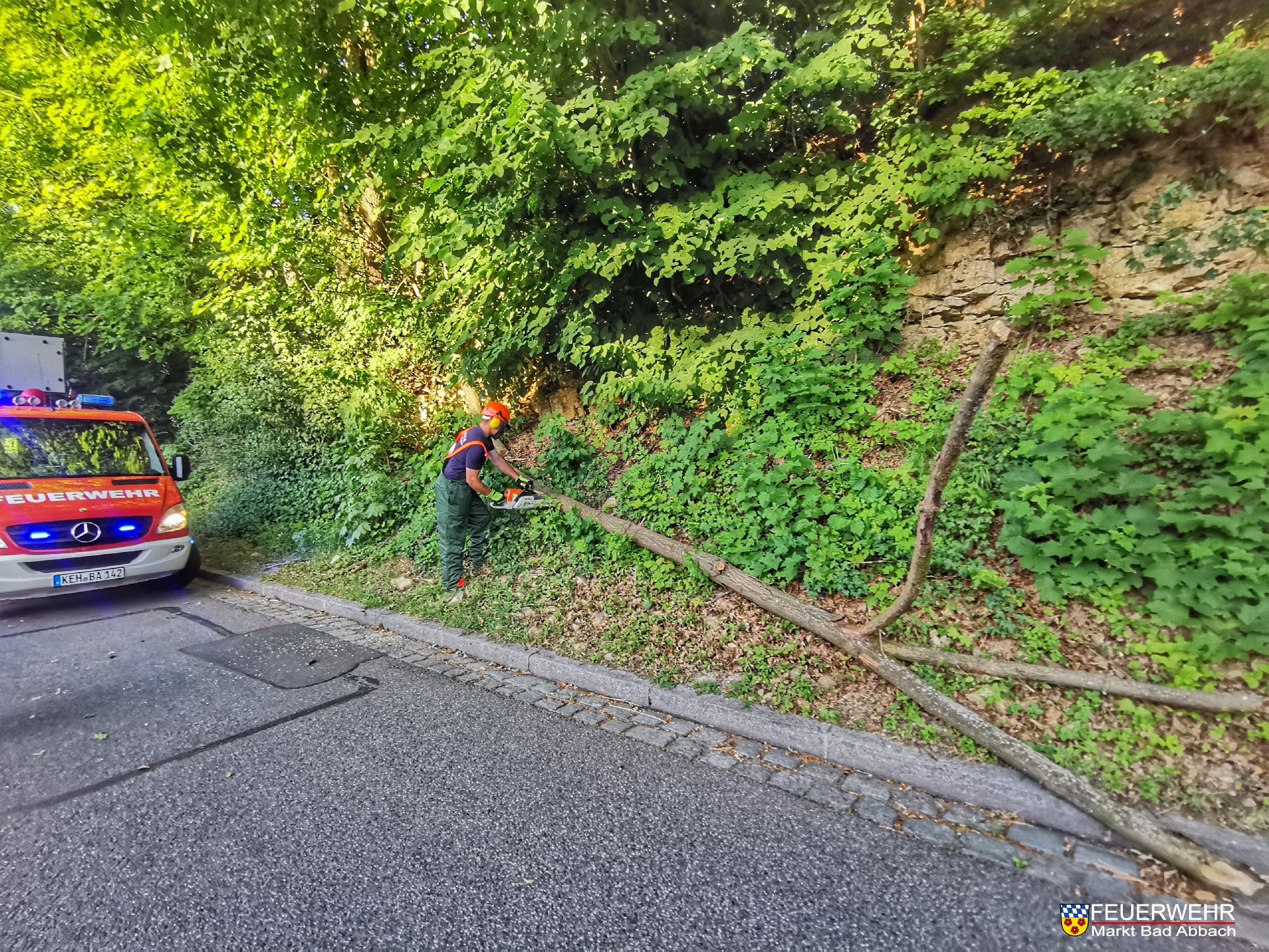Gegen 19:30 Uhr am heutigen Donnerstagabend wurden wir von der ILS Landshut telefonisch zu einem Baum der drohte umzufallen in den Turmblick alarmiert. Beim Eintreffen der Feuerwehr fiel der Baum bereits um und blockierte ein Teil der Fahrbahn. Der Baum wurde mittels Kettensäge entfernt.