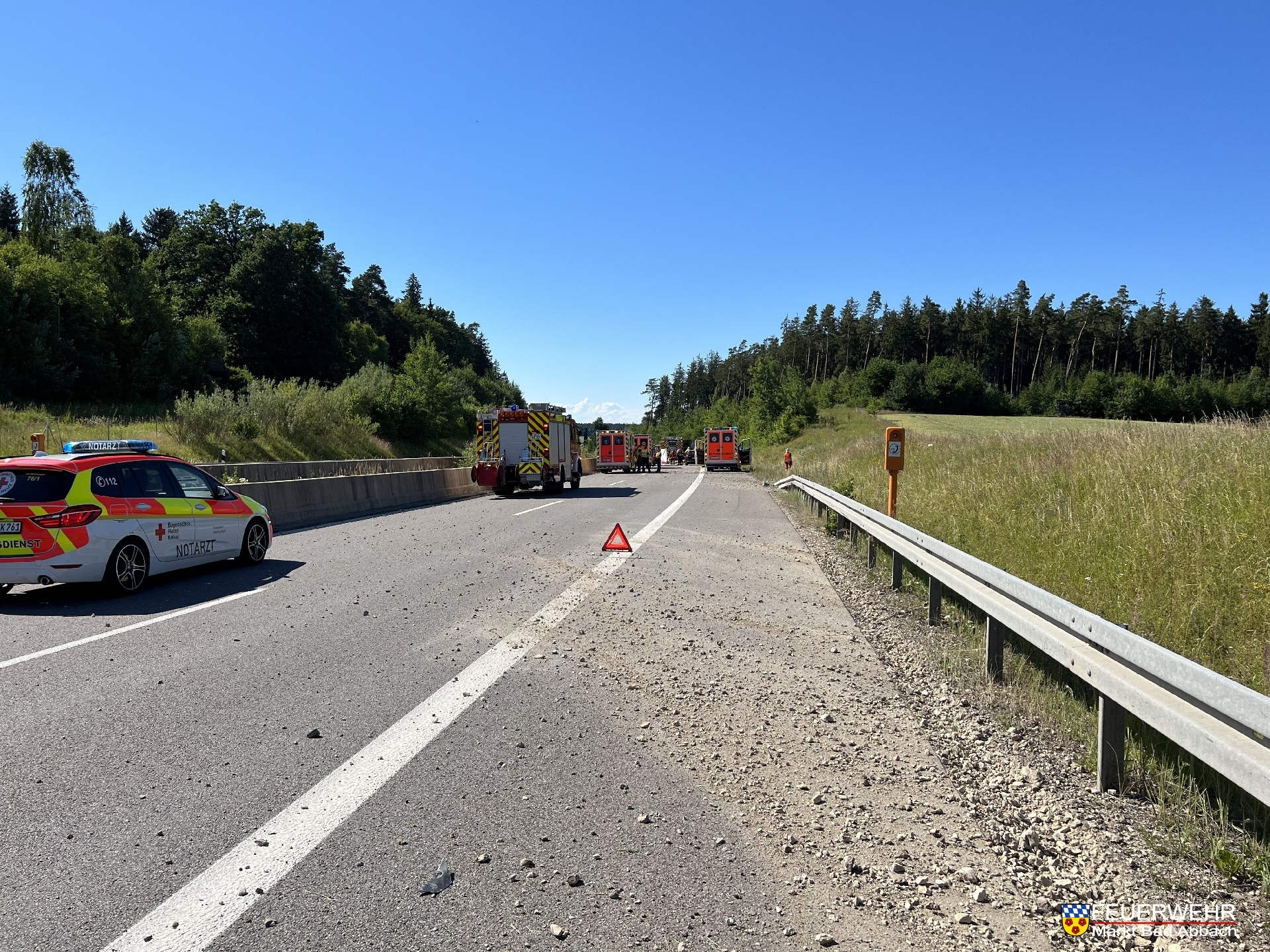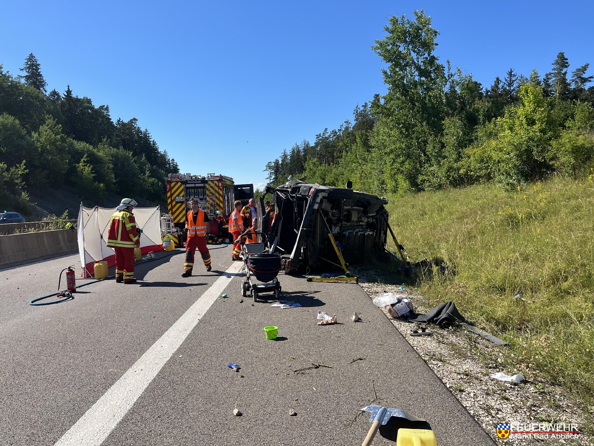 Aus bisher ungeklärter Ursache hat sich ein VW Van mehrfach überschlagen und ist in Schräglage auf dem Seitenstreifen liegen geblieben. Glücklicherweise konnten alle Insassen das Fahrzeug selbstständig verlassen.