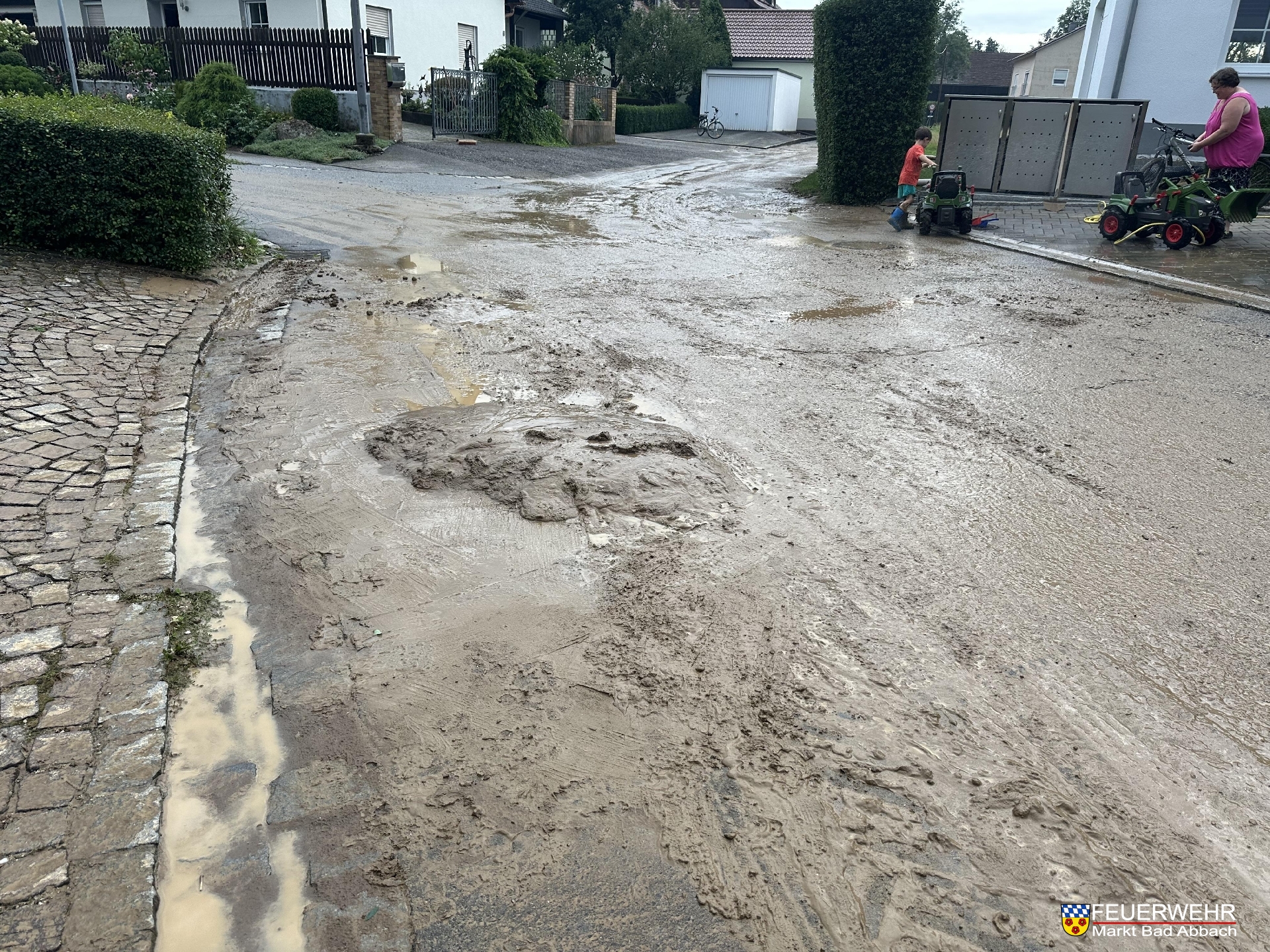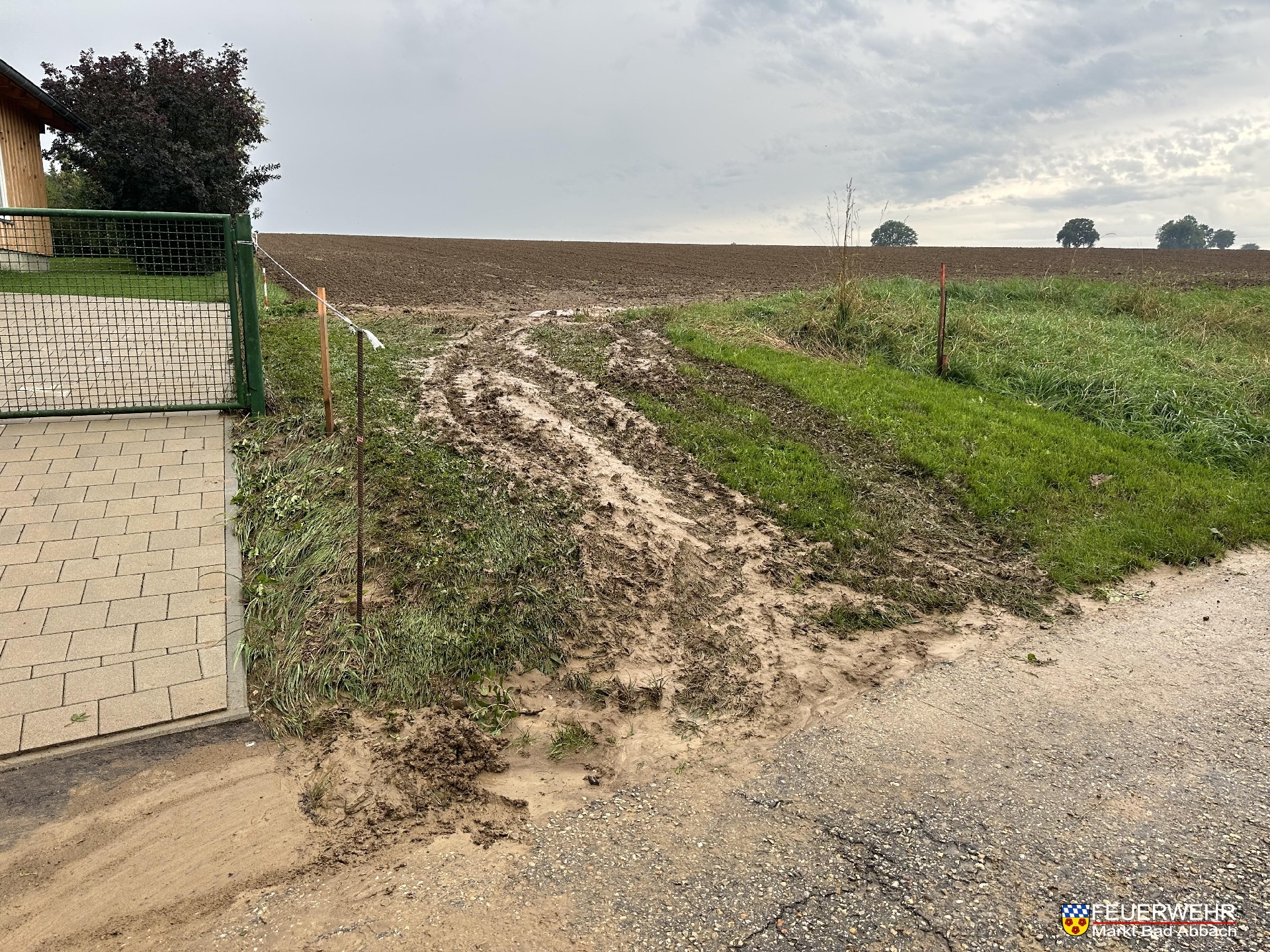 Ausgehend von einem Acker, überflutete ein Starkregenereignis die Fahrbahn am Sportplatz über eine Länge von rund 300 Metern mit Schlamm und Geröll.