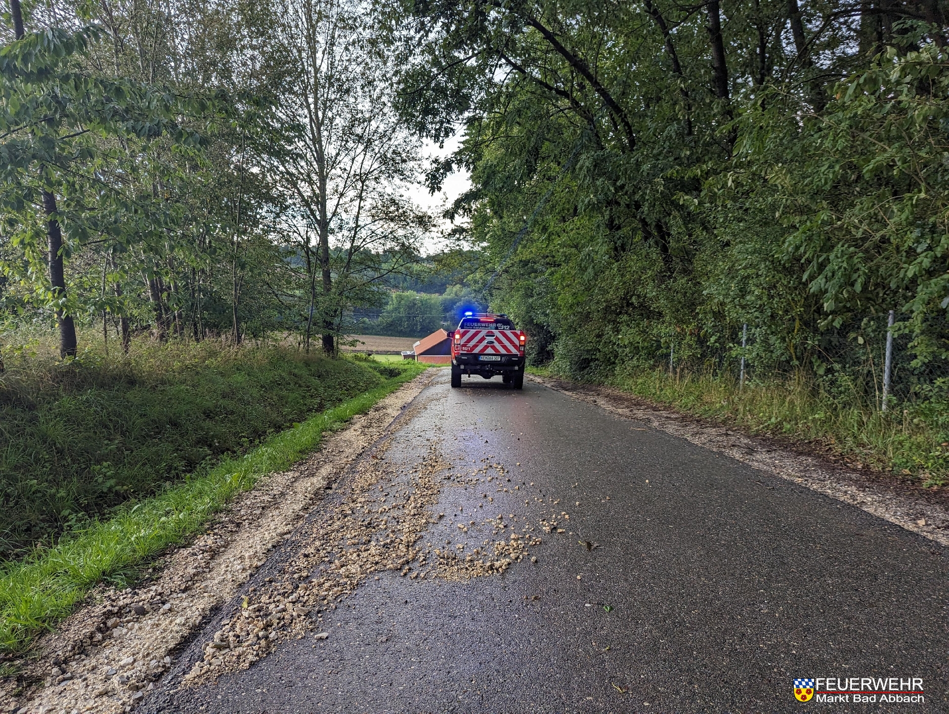 Ein Starkregenereignis verschmutzte die Stinkelbrunnstraße über eine Länge von rund 100 Metern mit Geröll. Die Hindernisse wurde beseitigt.