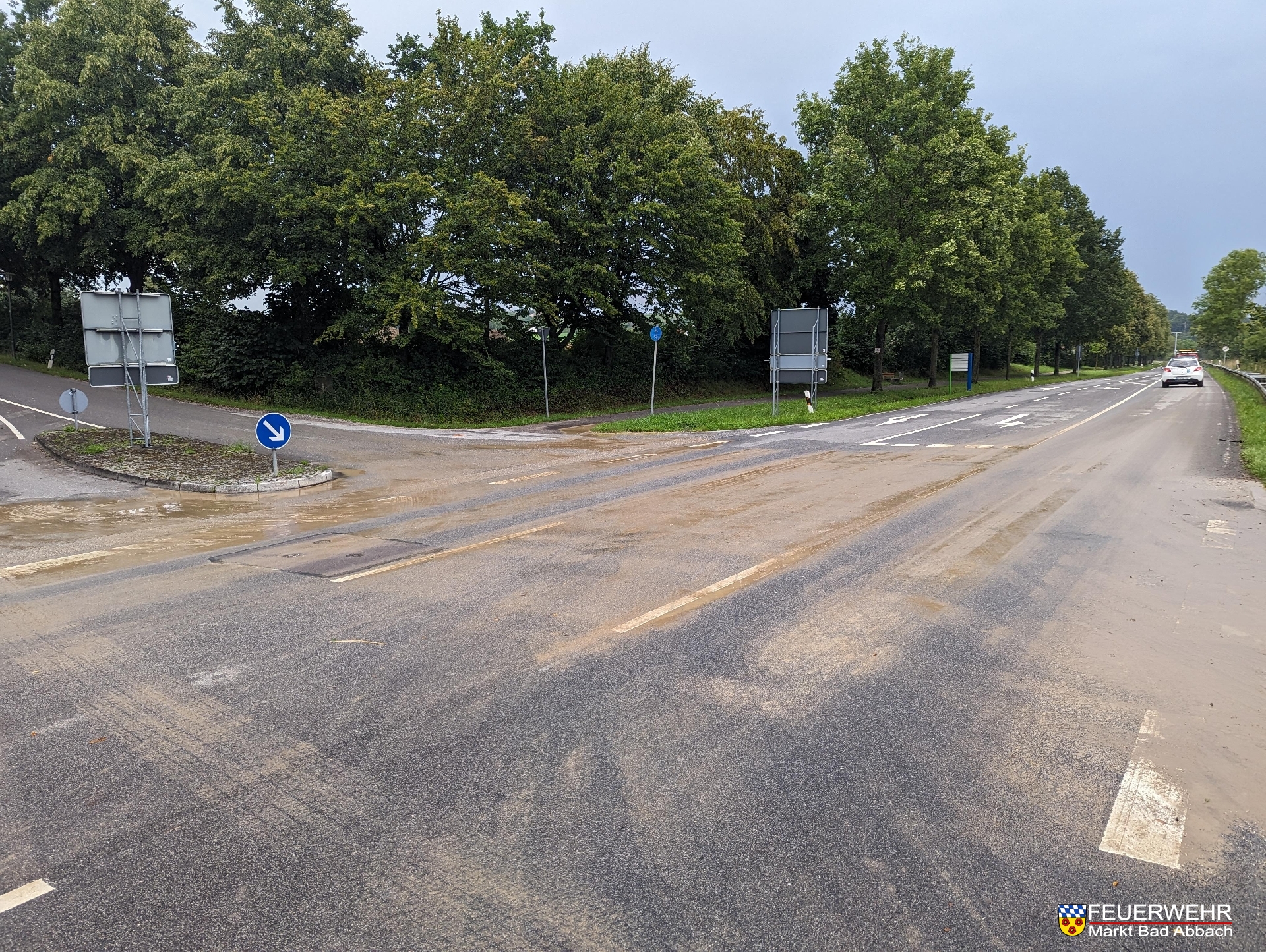Ausgehend von einem Acker, überflutete ein Starkregenereignis die Stinkelbrunnstraße im Kreuzungsbereich am Tunnelportal mit Schlamm und Geröll. Die Fahrbahn wurde gereinigt.