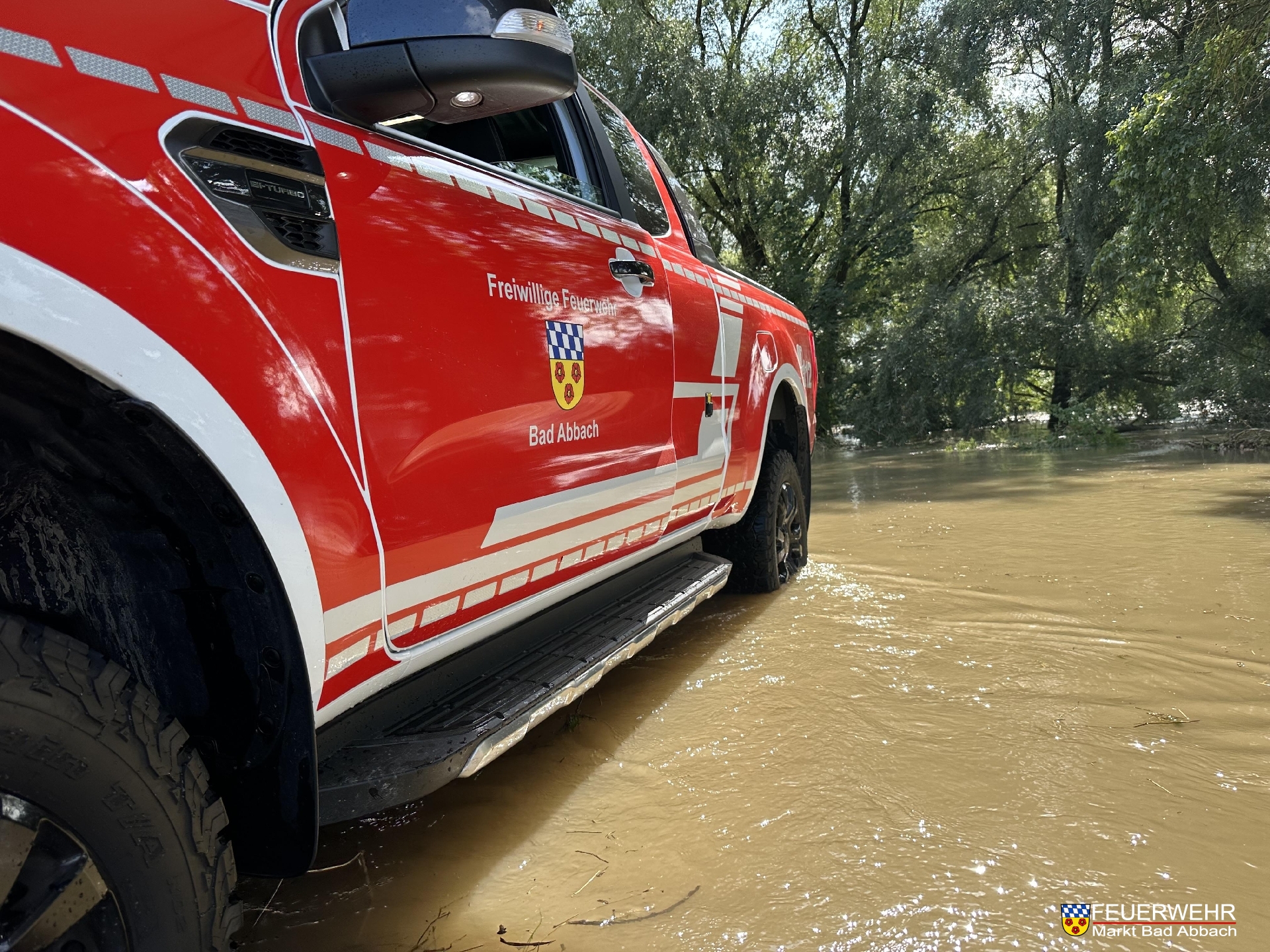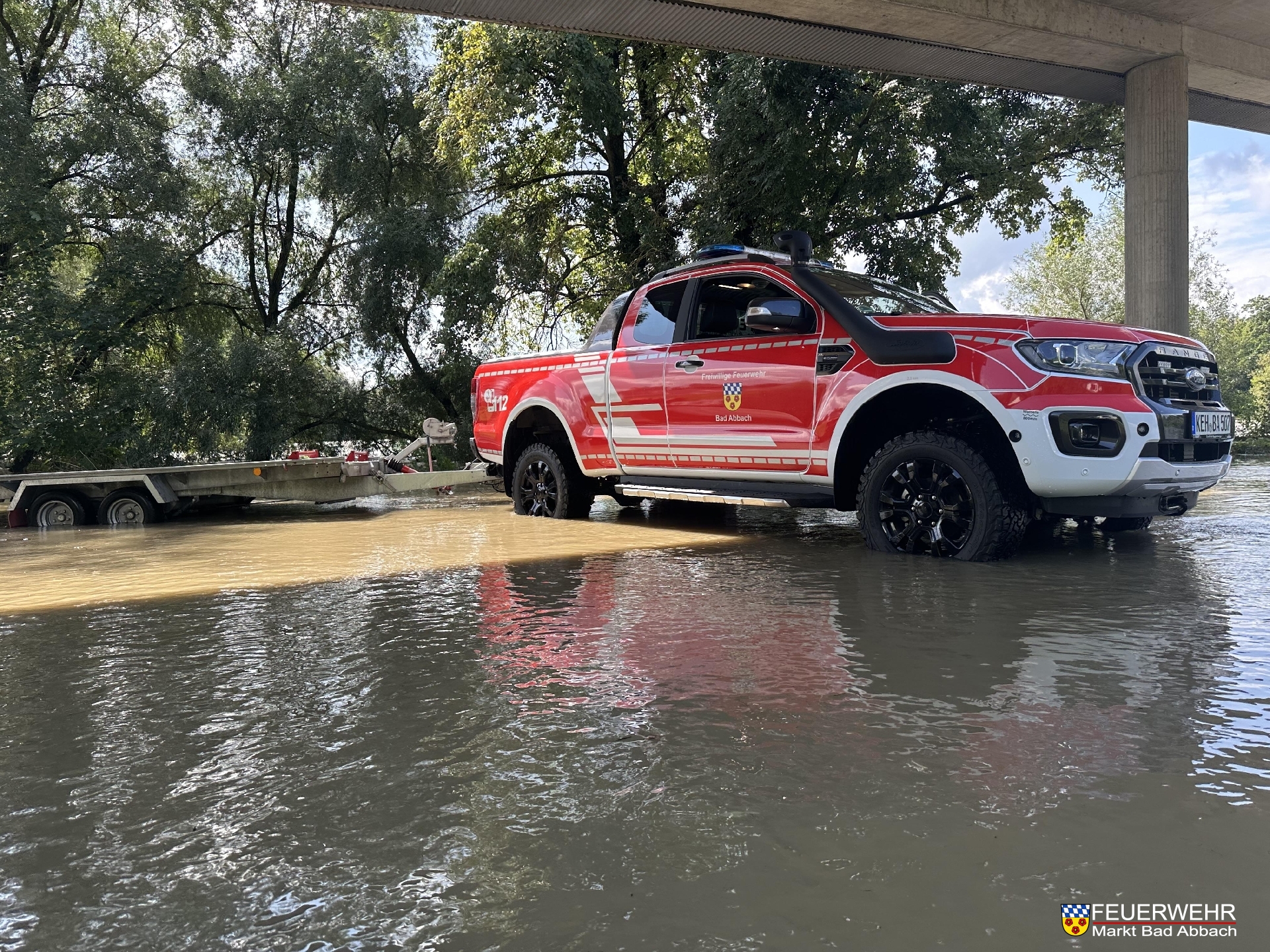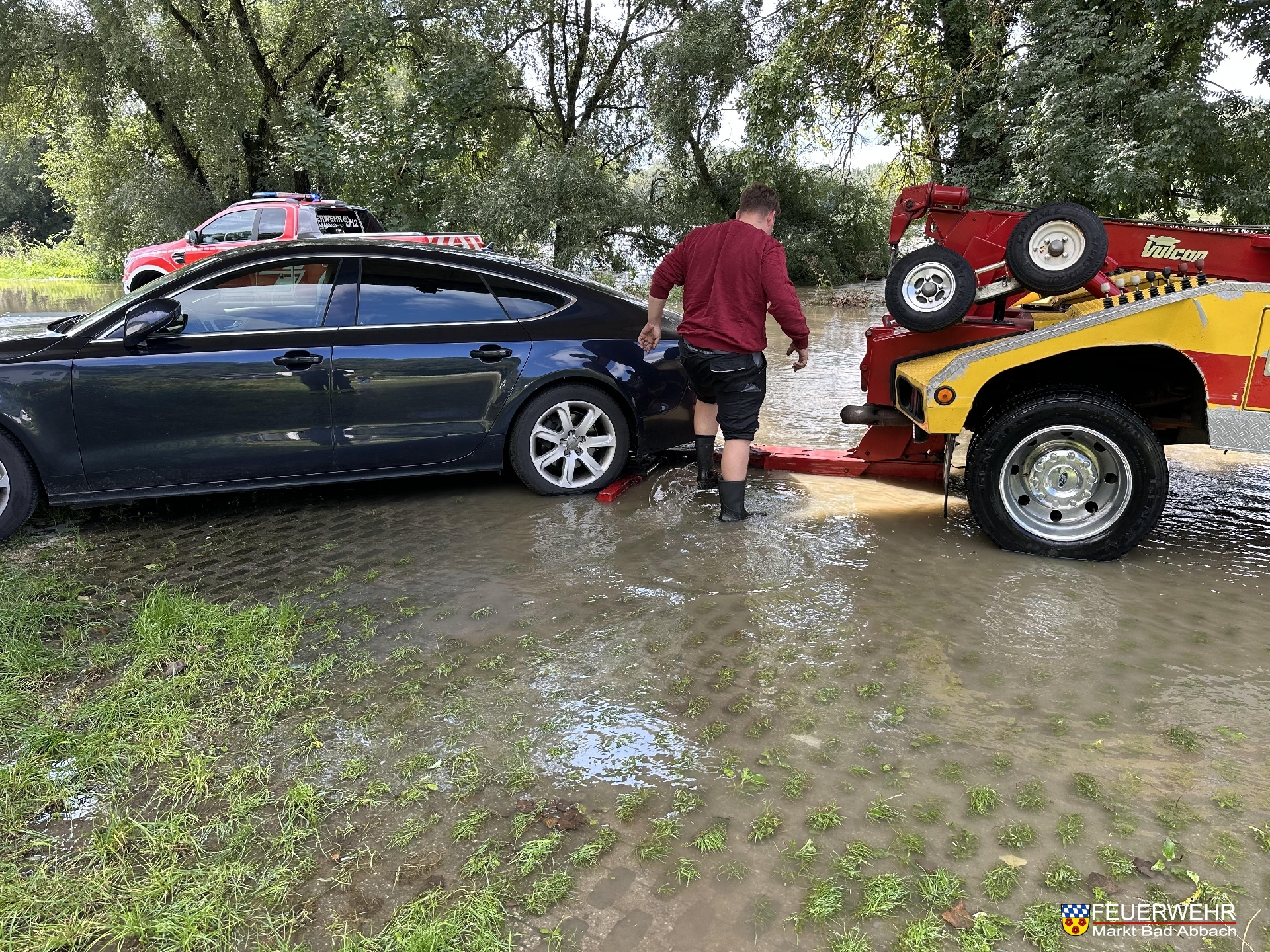 Nach Erkundung vor Ort mit dem tiefwassergeeigneten Gerätewagen wurde sich dazu entschlossen den Pkw abschleppen zu lassen und den Anhänger selbst zu retten.