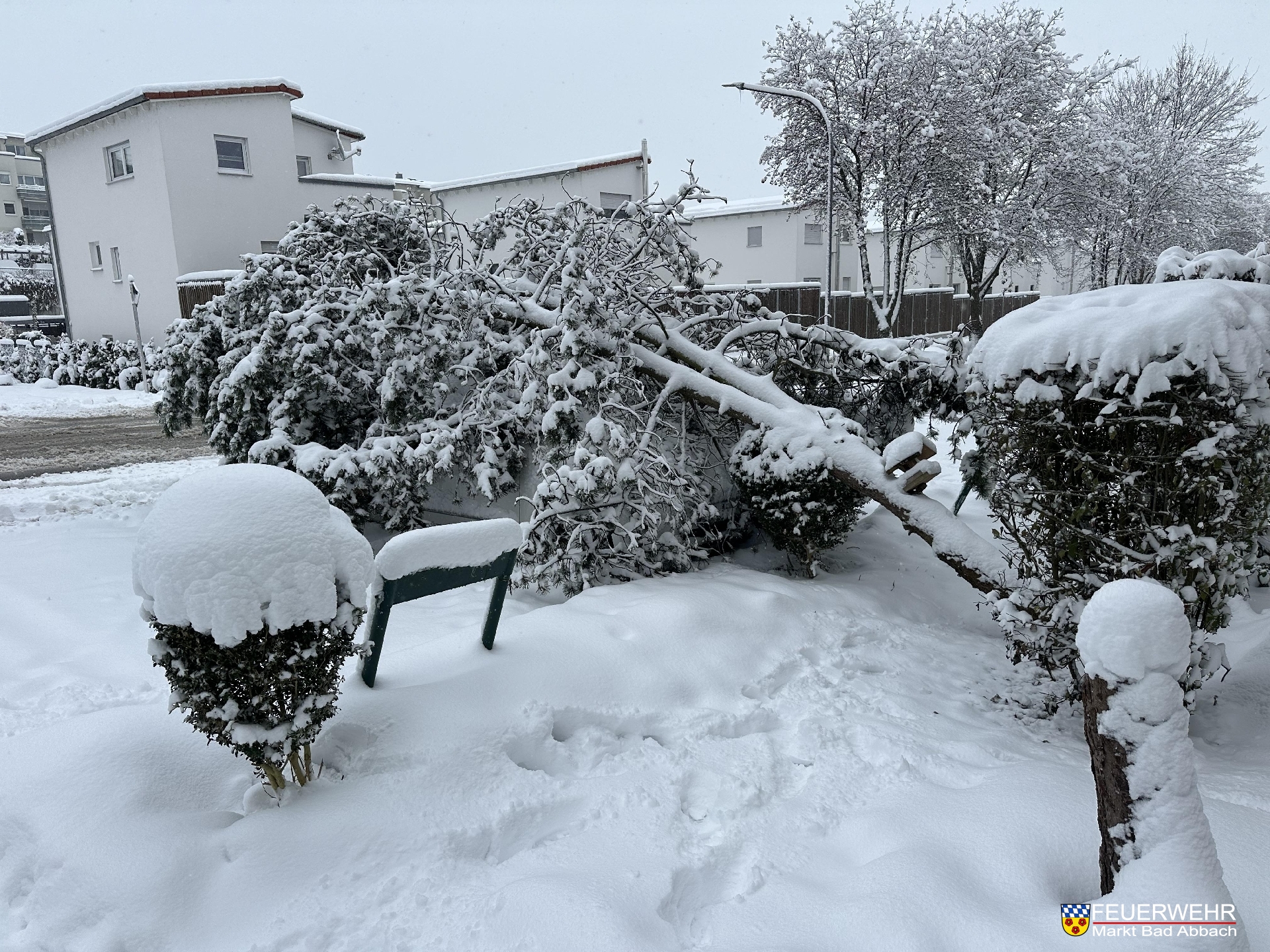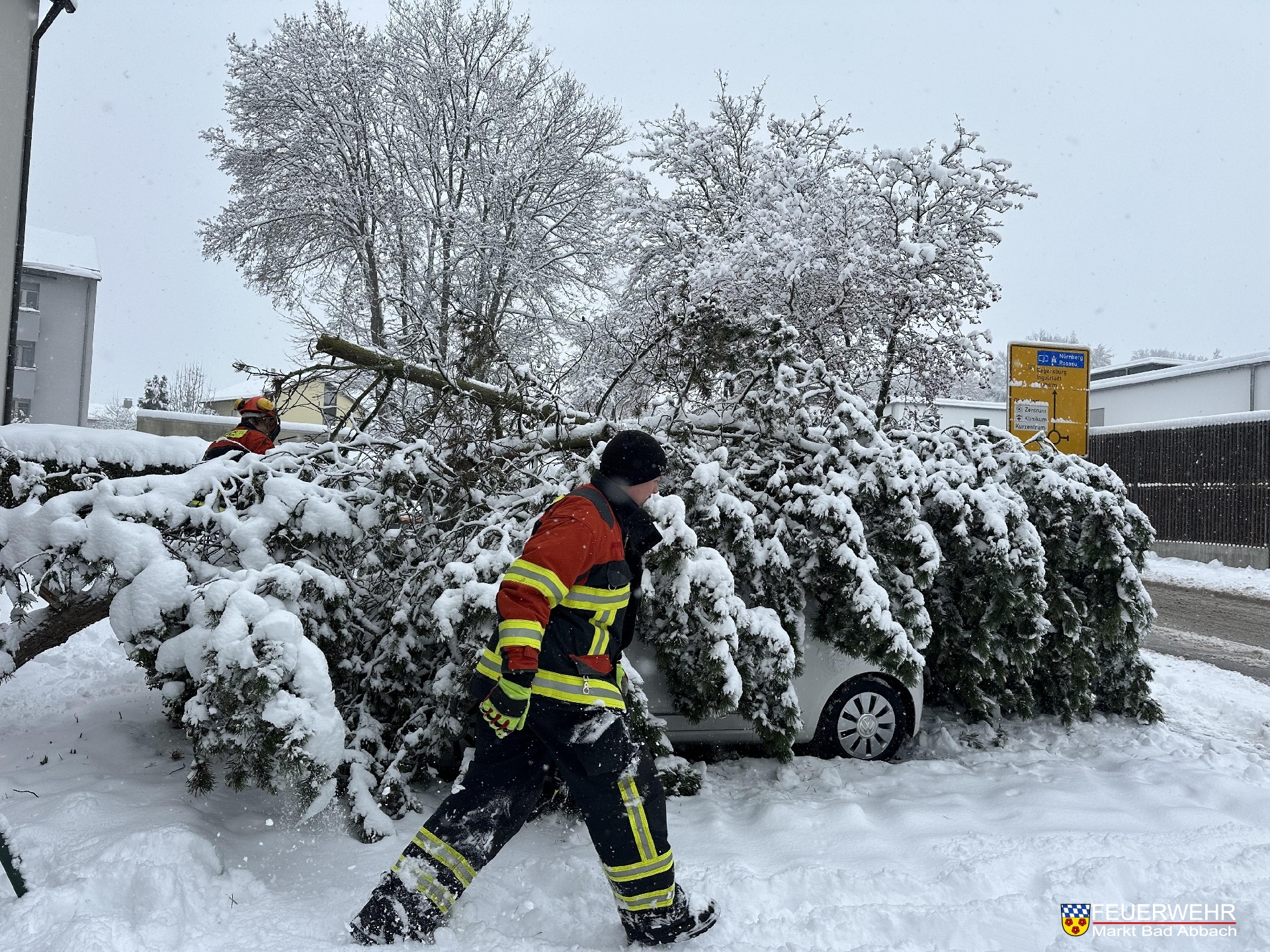 Ein Baum fiel durch Schneebruch auf ein parkendes Auto, dieser wurde mittels Motorsäge entfernt.