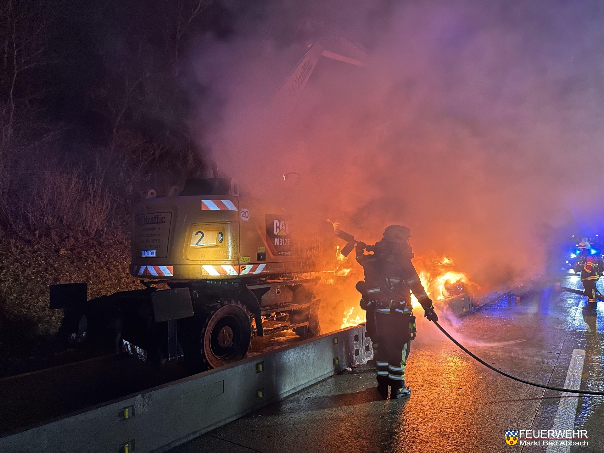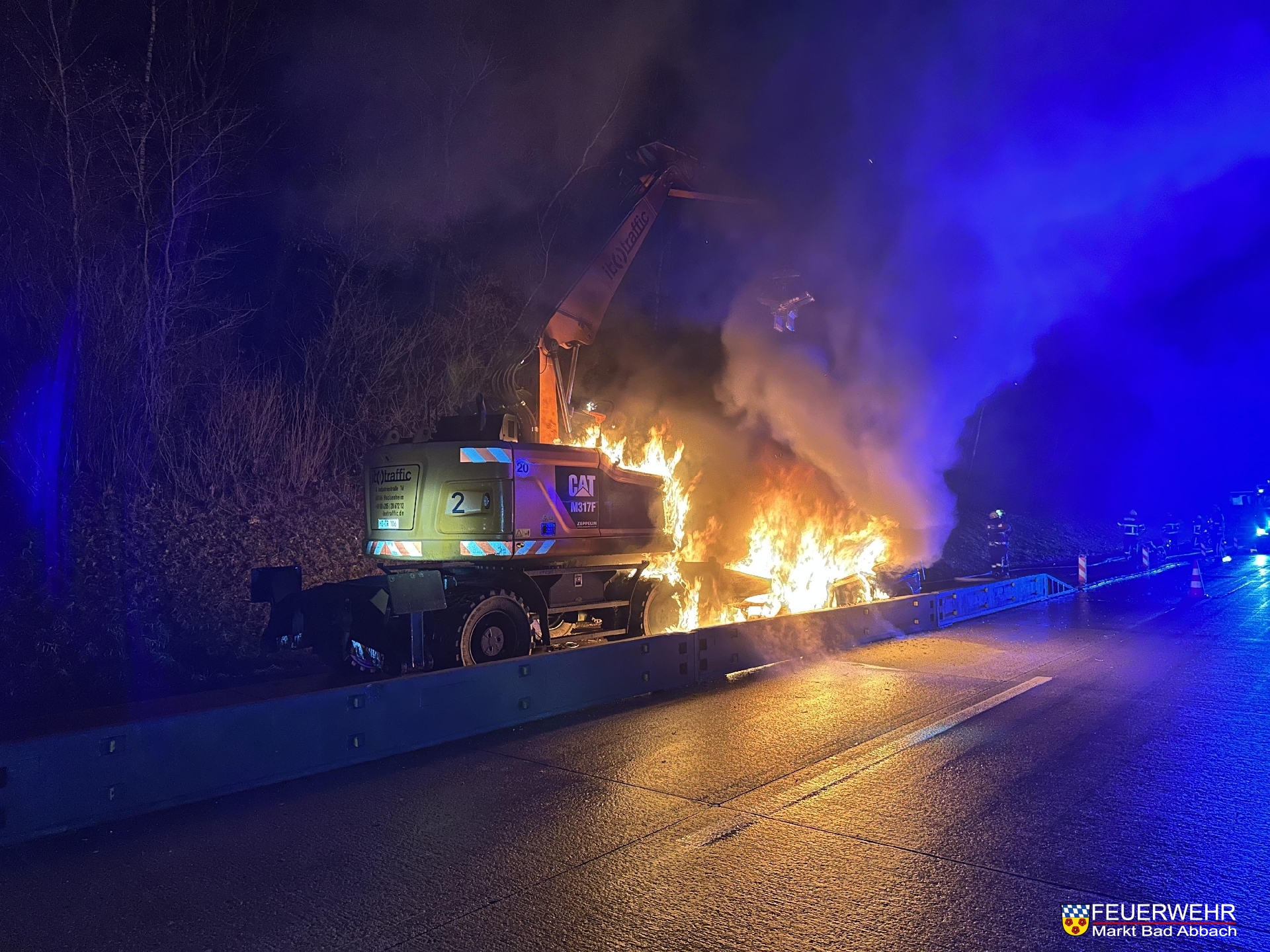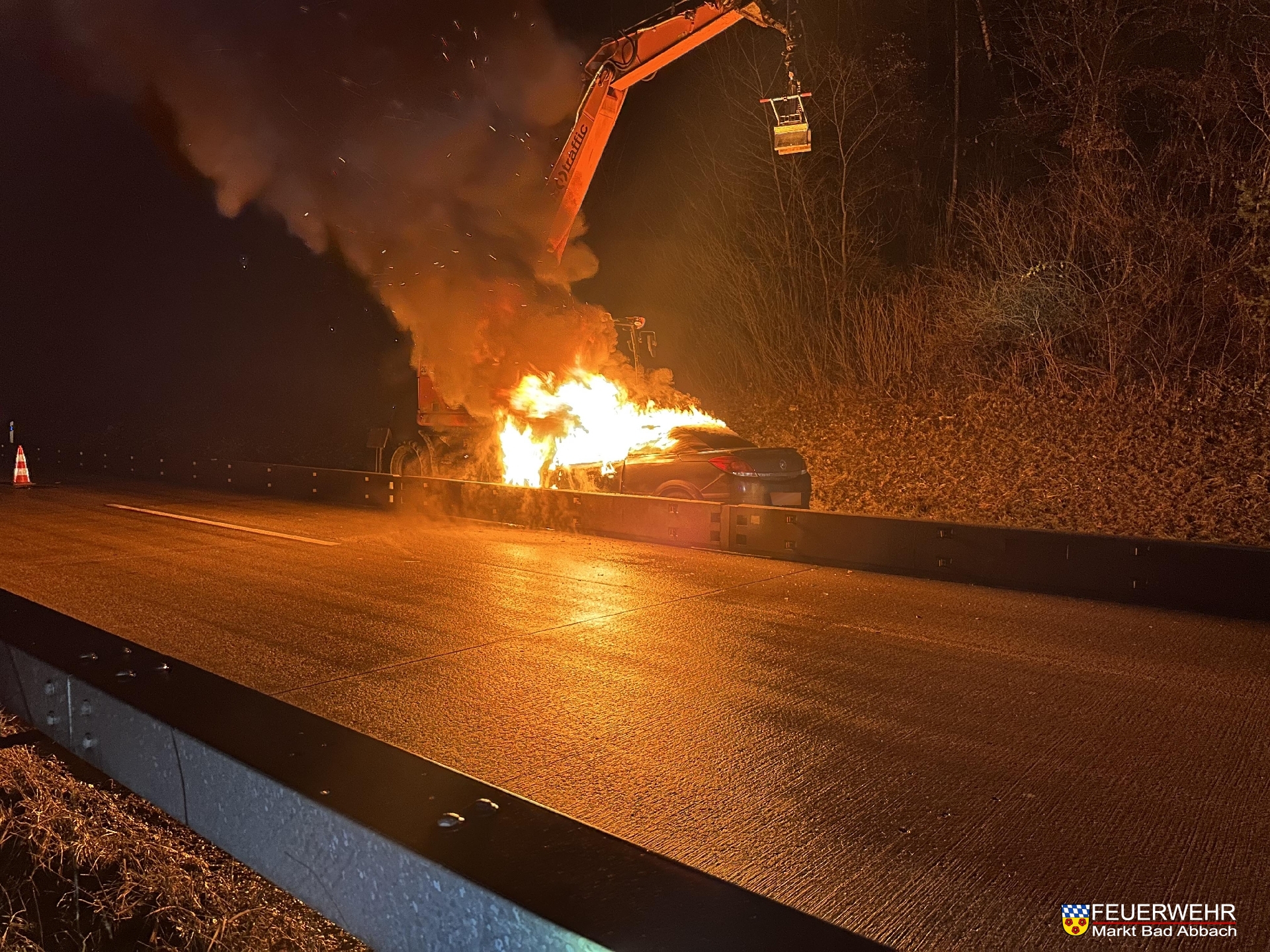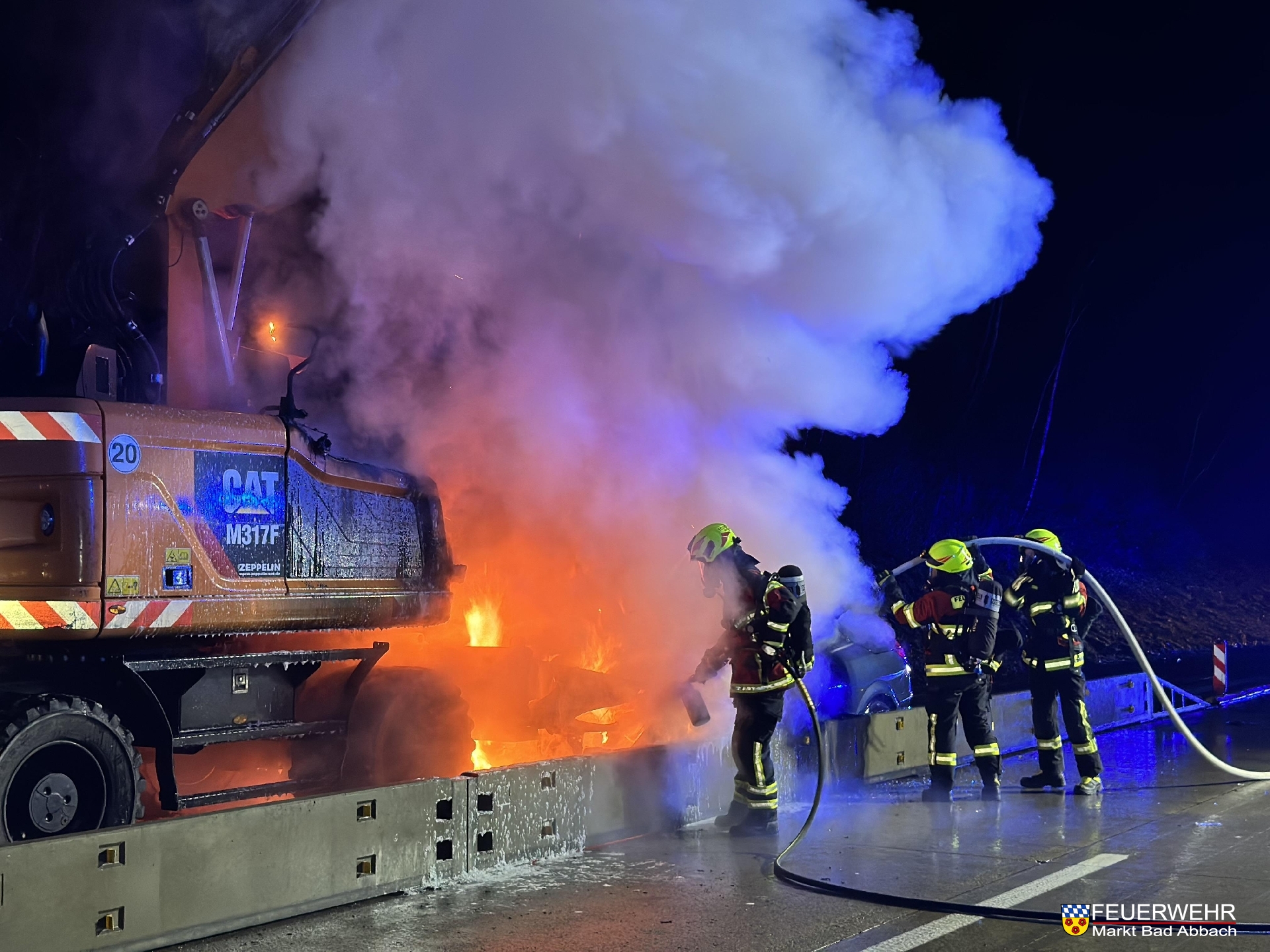 Aus bisher ungeklärter Ursache kollidierte der Fahrer eines Opel Astra mit einer im Baustellenbereich in Fahrtrichtung Regensburg abgestellten Arbeitsmaschine. Der Pkw fing daraufhin Feuer und stand bis zum Eintreffen der ersten Kräfte bereits im Vollbrand.