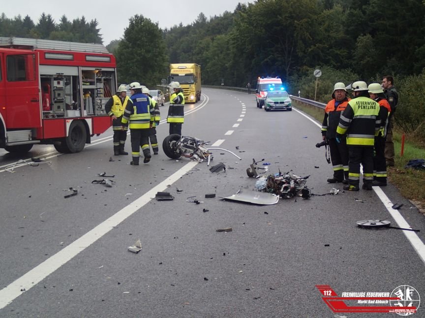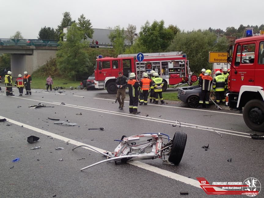 Zu einem schweren Verkehrsunfall wurden wir gemeinsam mit mehreren Feuerwehren des Lkr. Regensburgs auf die Bundesstraße 16 alarmiert. Es kam aus bislang ungeklärter Ursache zu einem Frontalzusammenstoß von zwei Pkw. Ein weiterer Pkw kollidierte mit diesem Unfall. Die Folge des Unfalls waren ein schwer, ein mittelschwer und ein leicht Verletzter. Ein beteiligter Sportwagen wurde durch den Zusammenstoß regelrecht zerfetzt. Zur Klärung der Unfallursache wurde ein Gutachter zum Erstellen eines unfallanalytischen Gutachtens zur Einsatzstelle beordert. Die Bundesstraße 16 war für die Einsatzdauer von 4,5 Stunden komplett gesperrt. Neben den Feuerwehren Pentling, Graßlfing, Großberg und Niedergebraching, war auch ein Rettungshubschrauber und mehrere Rettungsdienstfahrzeuge am Einsatzort.