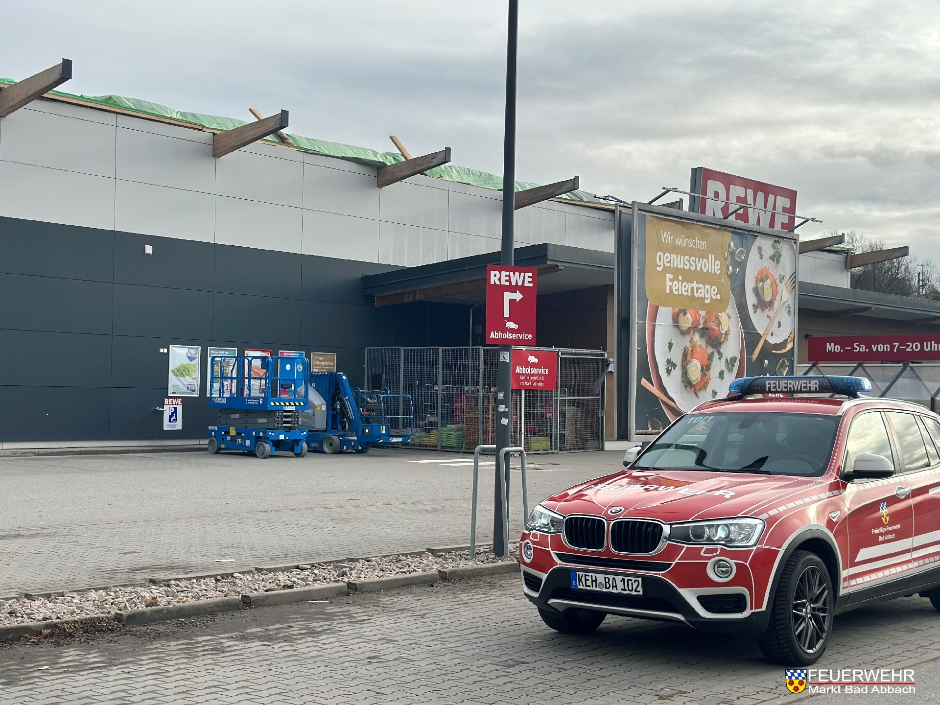 Erneut wurde die Einsatzstelle am REWE-Markt Bad Abbach zu einer Nachkontrolle des Wassereintritts und der provisorischen Dachkonstruktion angefahren.