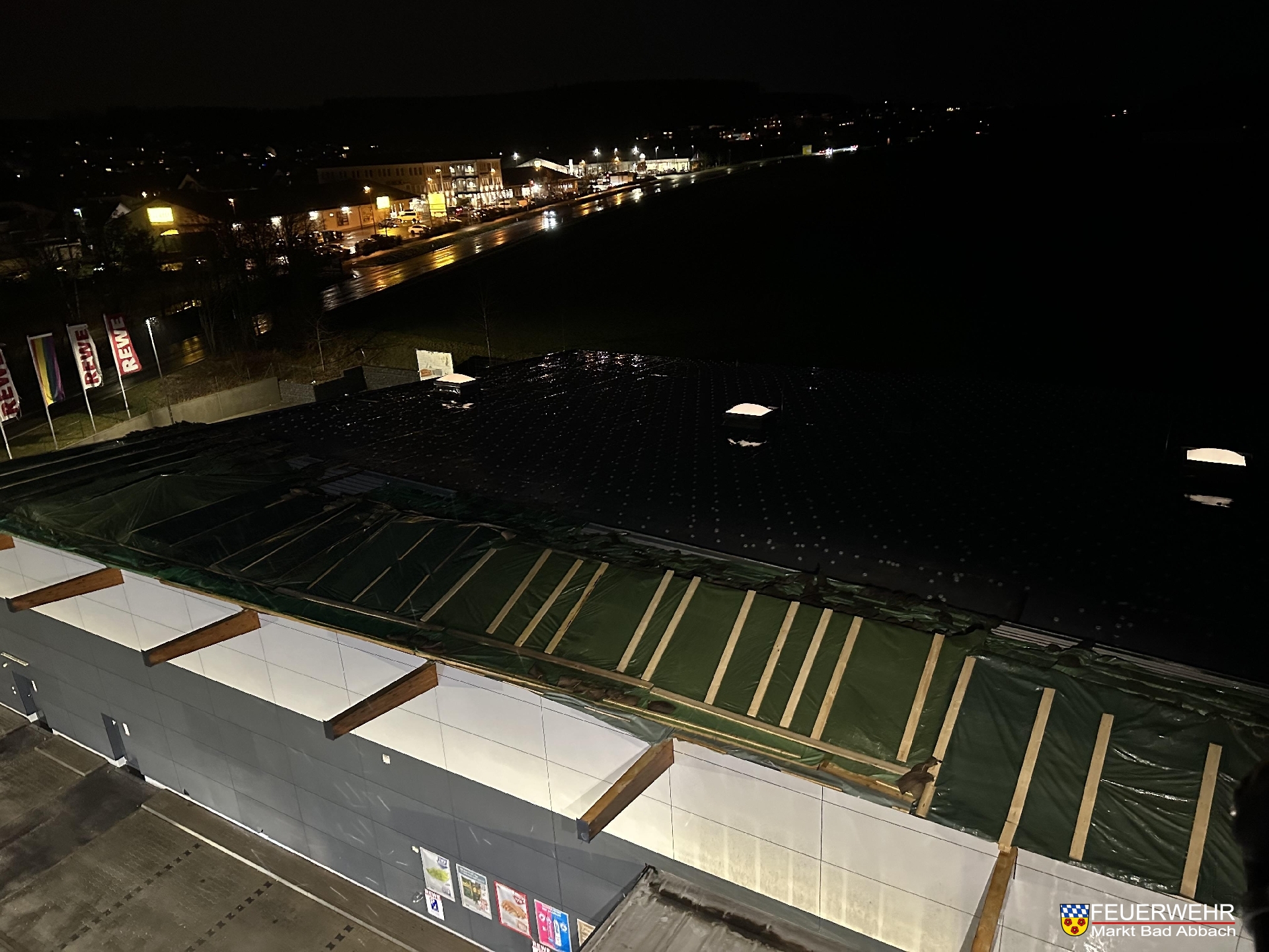 Durch den Einsatz unserer und der Drehleiter der Feuerwehr Kelheim-Stadt und vielen handwerklichen Händen wurde innerhalb 7 Stunden ein provisorischer Dachstuhl über die knapp 60 Meter breite Schadensstelle gebaut.