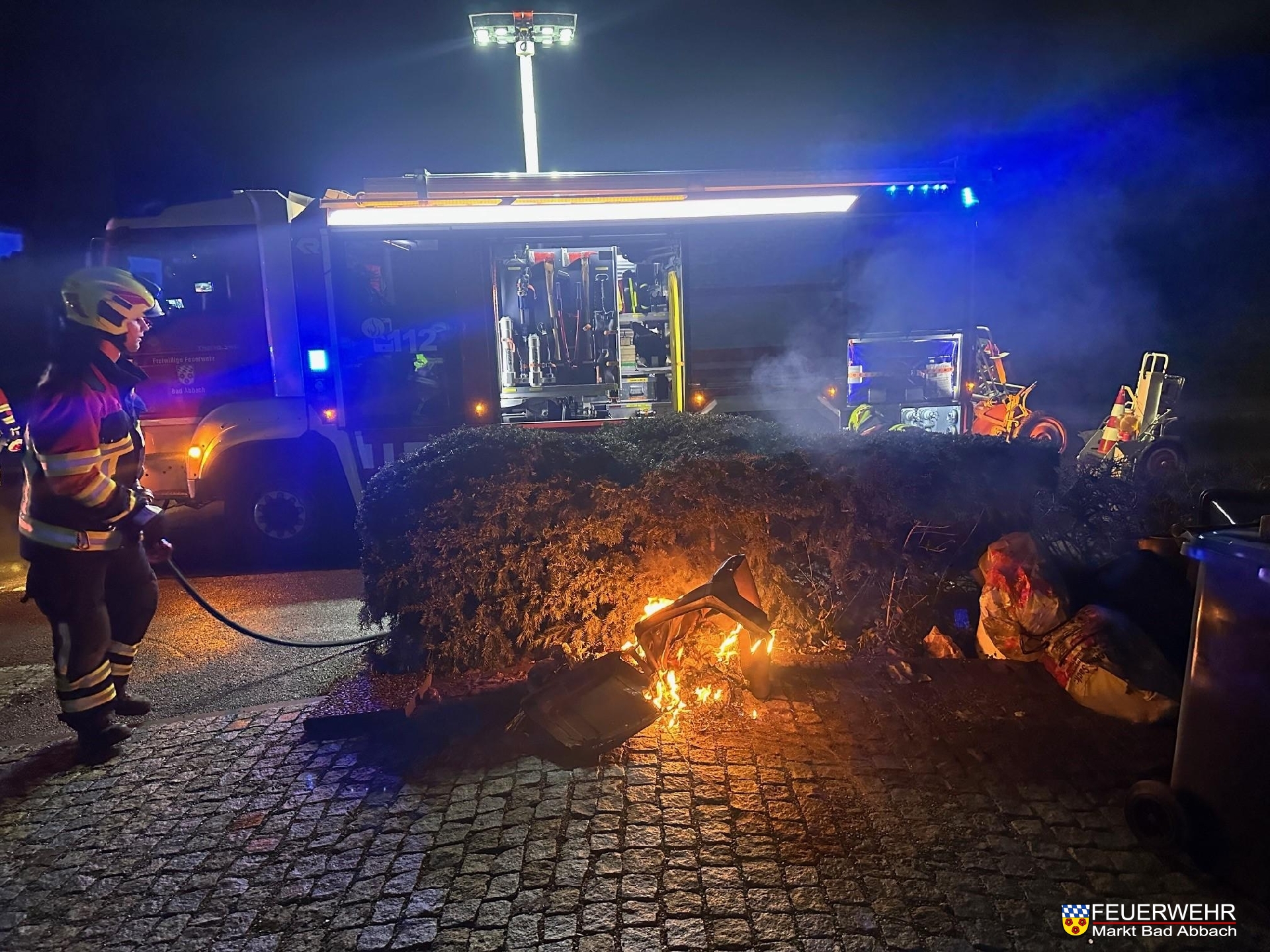 Aus ungeklärter Ursache geriet eine Biotonne am Straßenrand in Brand, welche mit einem Schnellangriffschlauch abgelöscht wurde.