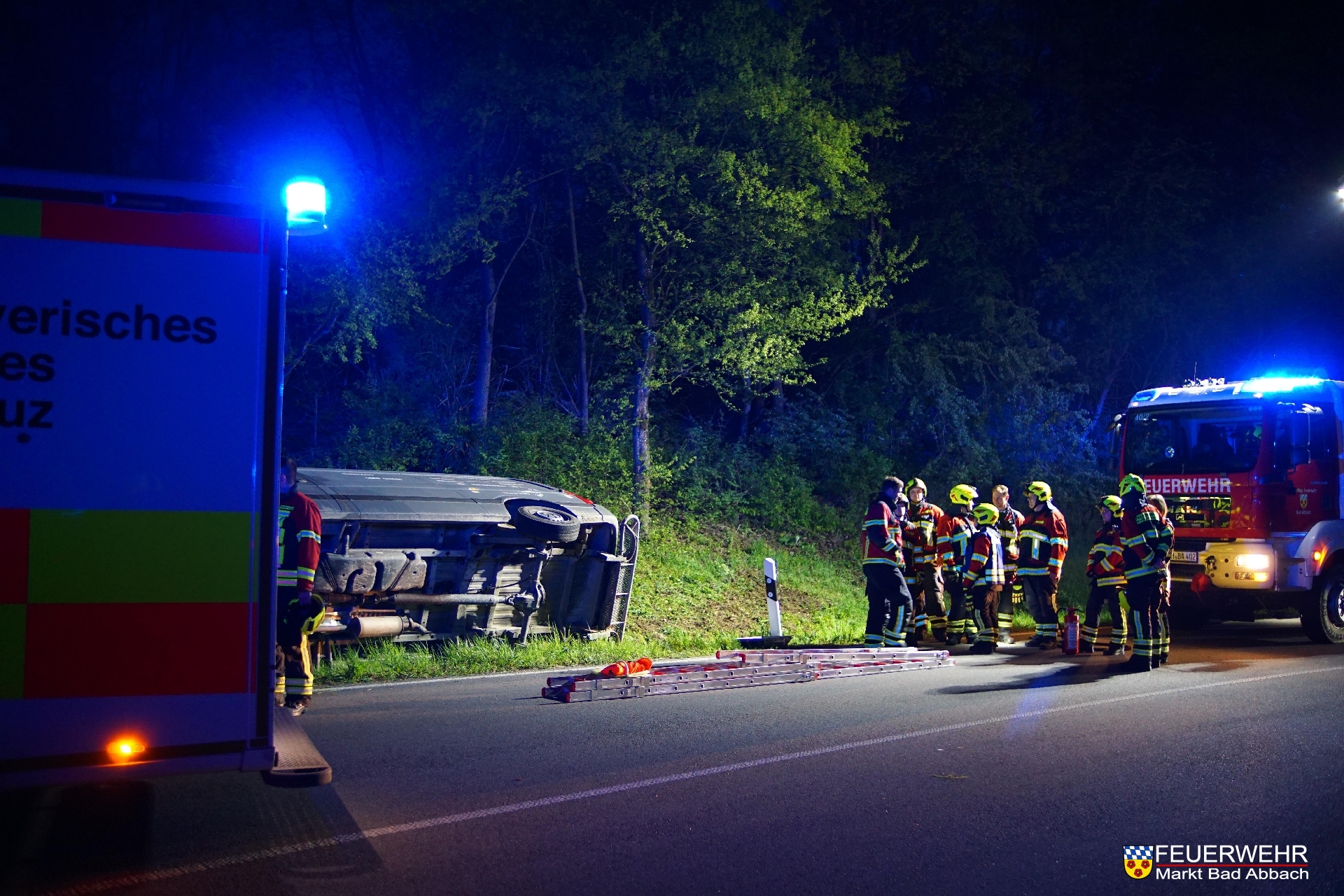 Um 5:02 Uhr wurden wir mit der Meldung "Verkehrsunfall mit Überschlag" auf die Auffahrtsschleife der Bundesstraße 16 Nord alarmiert. Ein alleinbeteiligten VW Kastenwagen kam aus bisher ungeklärter Ursache von der Fahrbahn und kippte zur Seite.