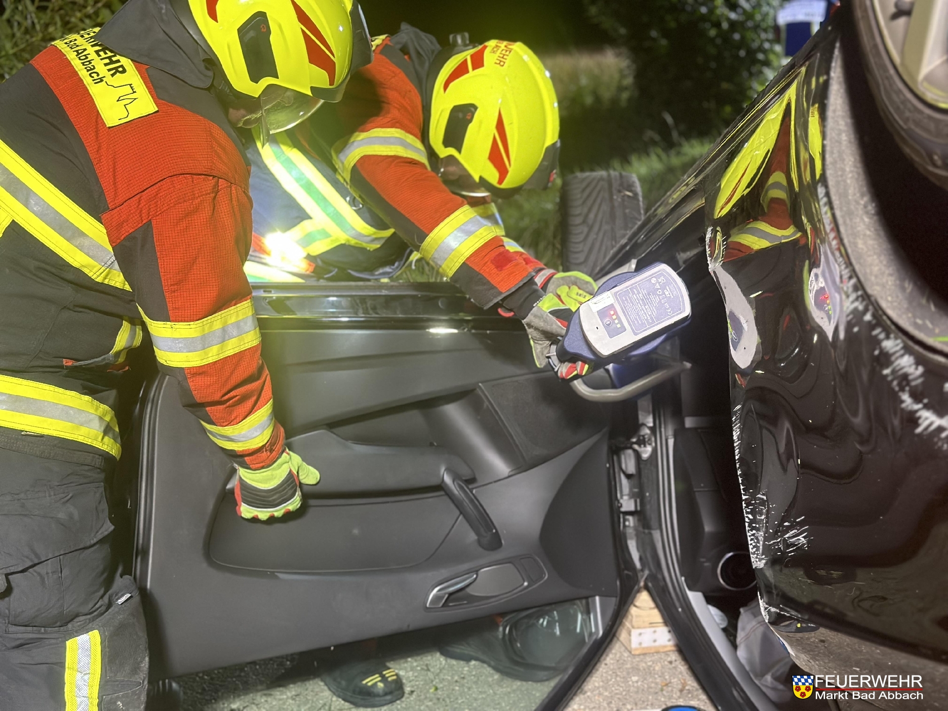 Aufgrund dieser Dachlage und der Deformation des Fahrzeuges, wurde sich für eine patientenschonende Rettung unter Einsatz eines hydraulischen Rettungsgeräts entschieden.