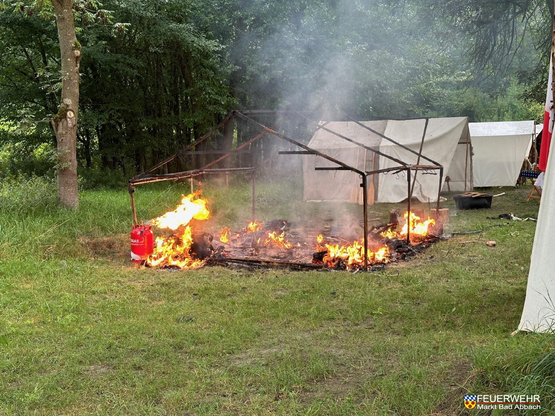 Aufgrund eines technisches Defekts geriet eine Gasflasche in Brand und entzündete ein daneben stehendes Campingzelt samt Inhalt.