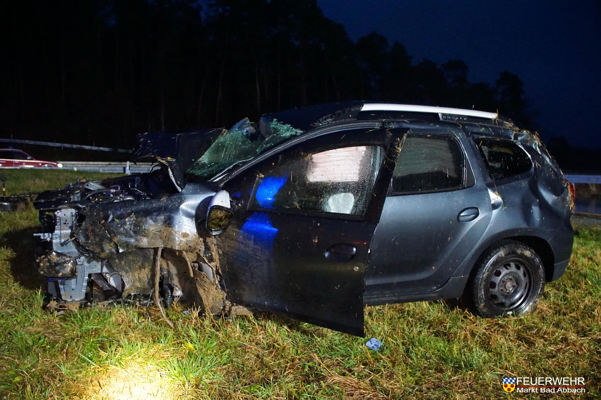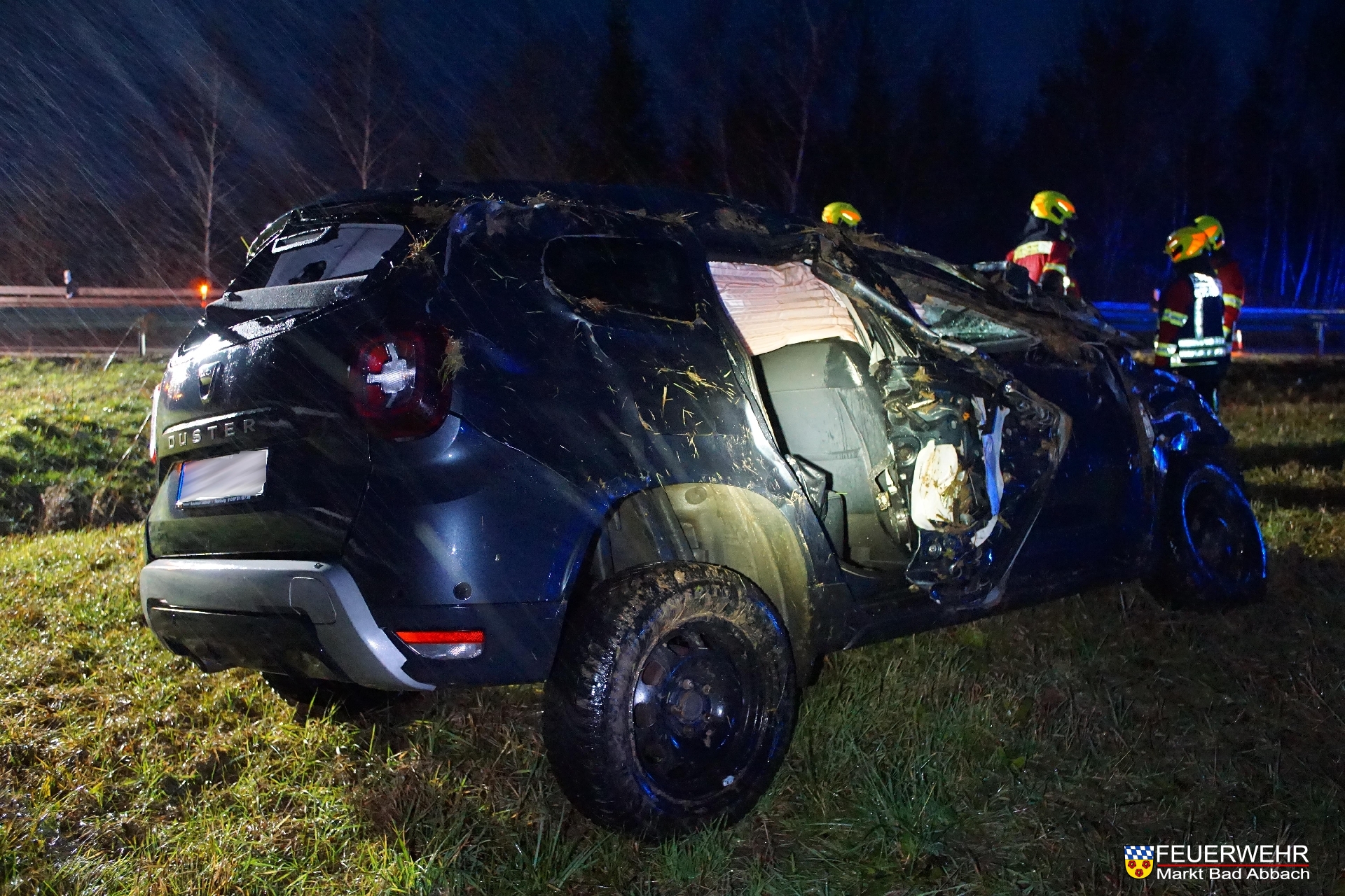 Das Fahrzeug der Marke Dacia überschlug sich nach dem Verlassen der Fahrbahn mehrfach im Grünbereich und wurde dabei stark deformiert. Der verletzte Fahrer konnte sich sich glücklicherweise selbstständig befreien.