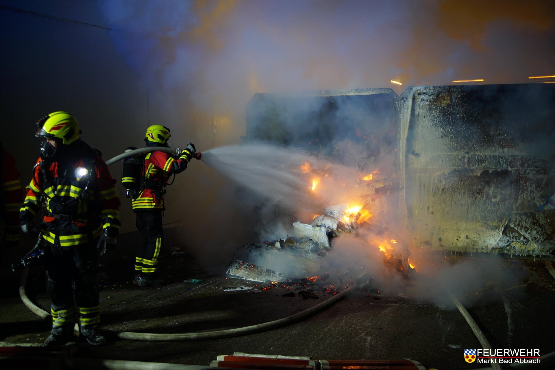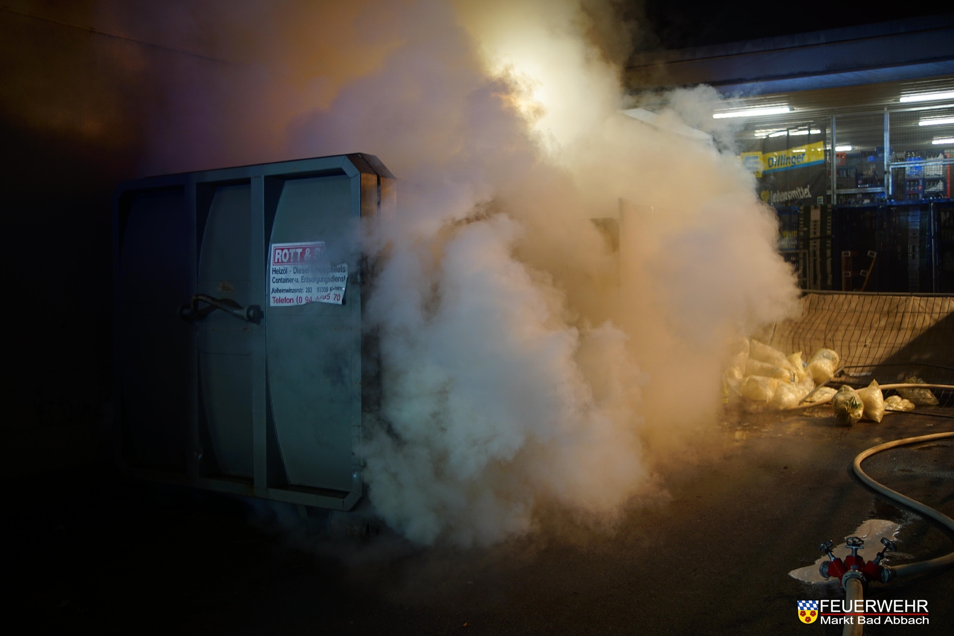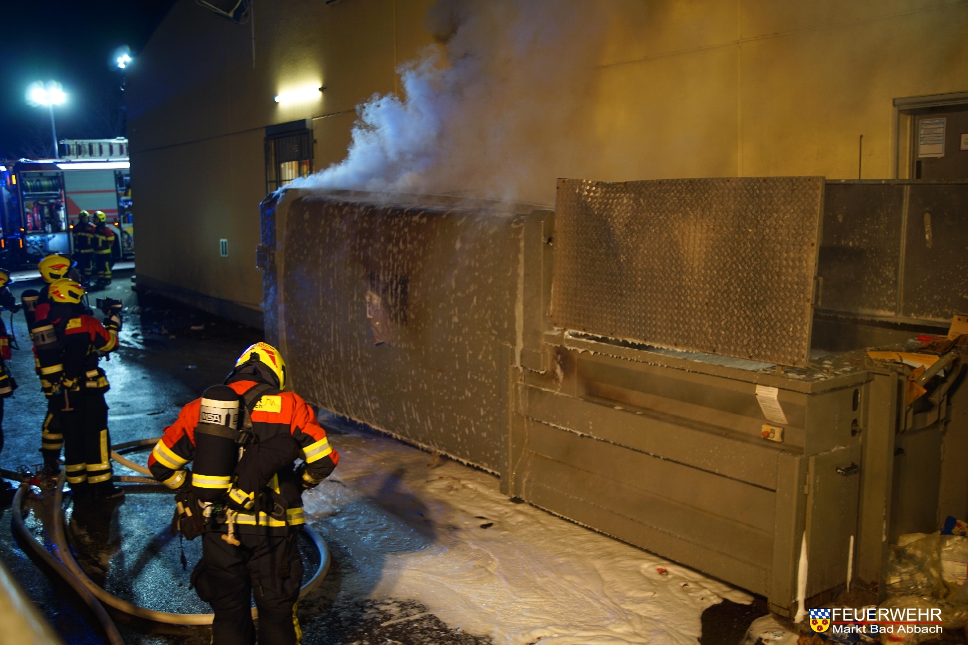 Bereits auf der Anfahrt des Führungsdienstes war eine massive Rauchentwicklung feststellbar, was sofort auf ein größeres Ausmaß hindeutete. Eine erste Erkundung ergab den Brand einer im Verladebereich des Marktes abgestellten Papierpresse, welche vermutlich durch Feuerwerkskörper in Brand gesetzt wurde. Zeugen beobachteten zwei weglaufende Jugendliche!
