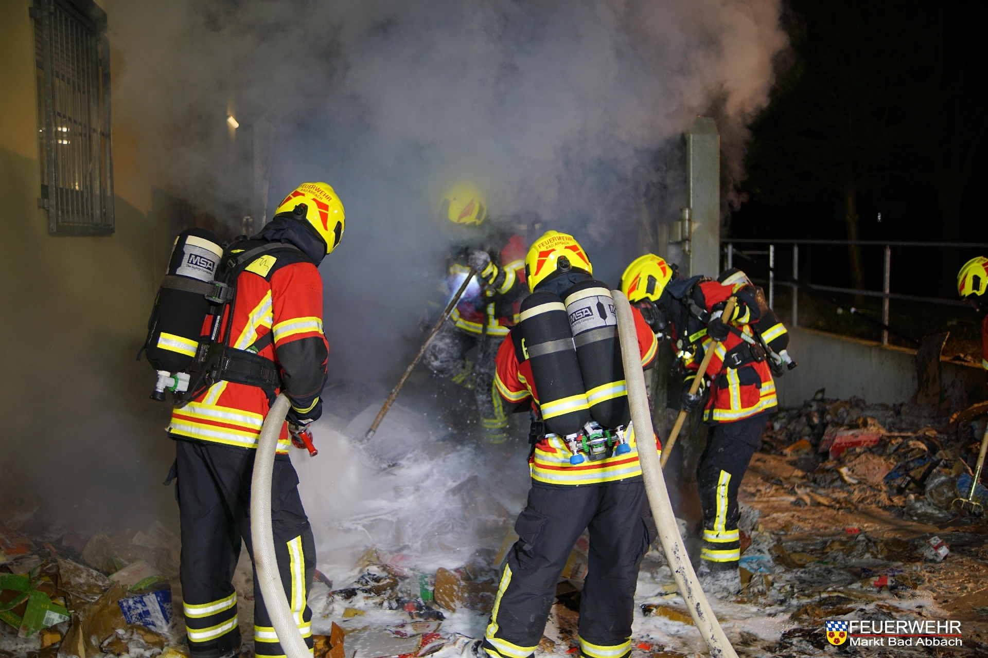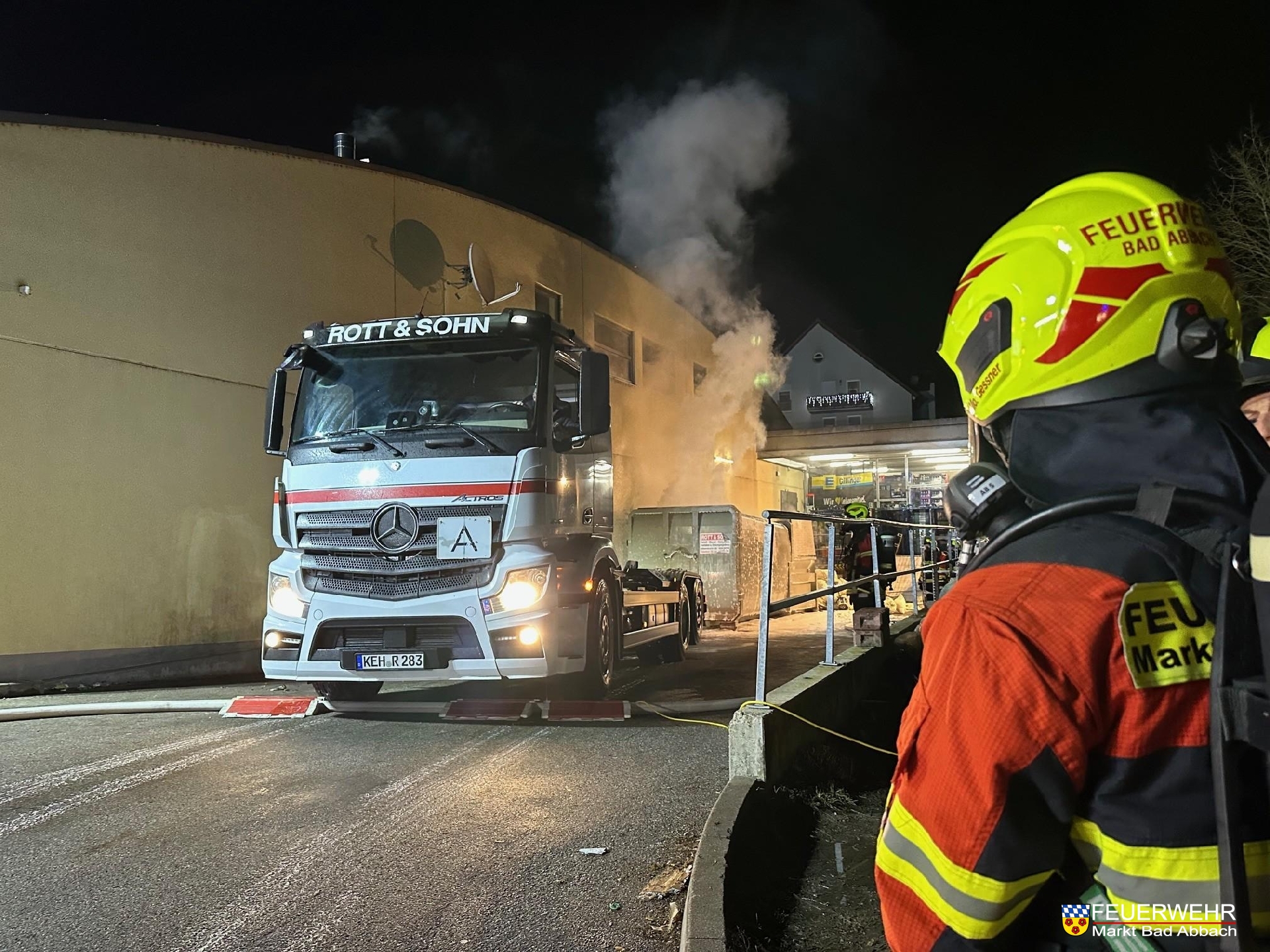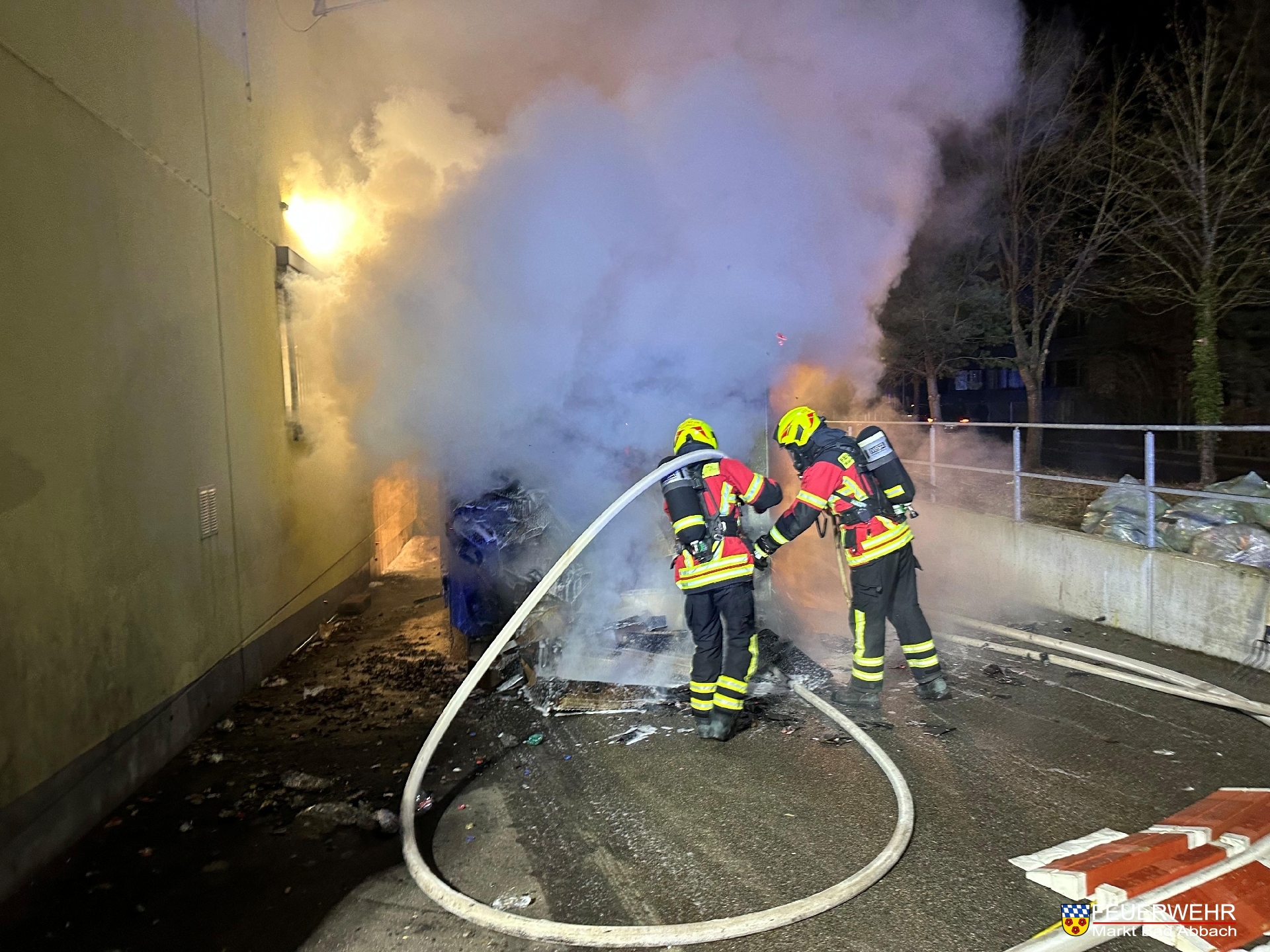 Bereits auf der Anfahrt des Führungsdienstes war eine massive Rauchentwicklung feststellbar, was sofort auf ein größeres Ausmaß hindeutete. Eine erste Erkundung ergab den Brand einer im Verladebereich des Marktes abgestellten Papierpresse, welche vermutlich durch Feuerwerkskörper in Brand gesetzt wurde. Zeugen beobachteten zwei weglaufende Jugendliche!