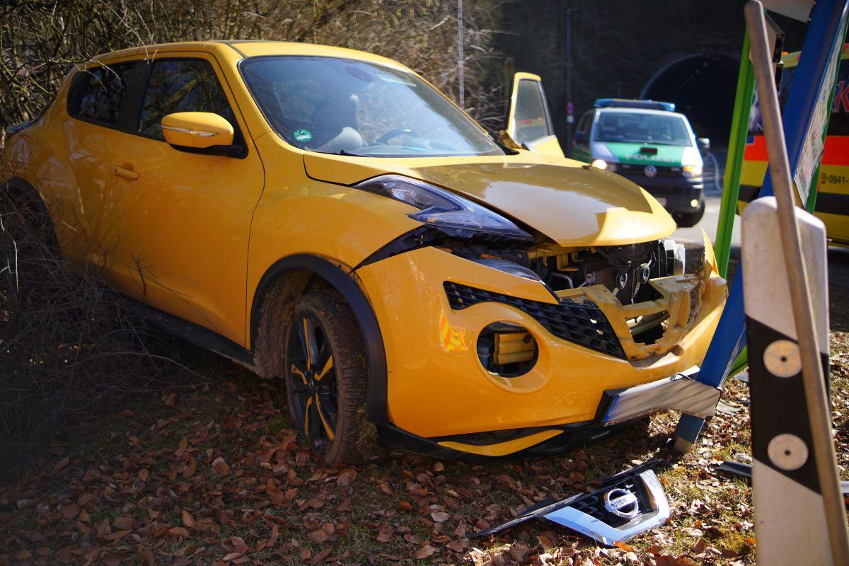Ein alleinbeteiligtes Fahrzeug der Marke Nissan kam aus bisher ungeklärter Ursache von der Fahrbahn ab, touchierte eine Wegweiserbeschilderung und bliebt im angrenzenden Gebüsch stehen.