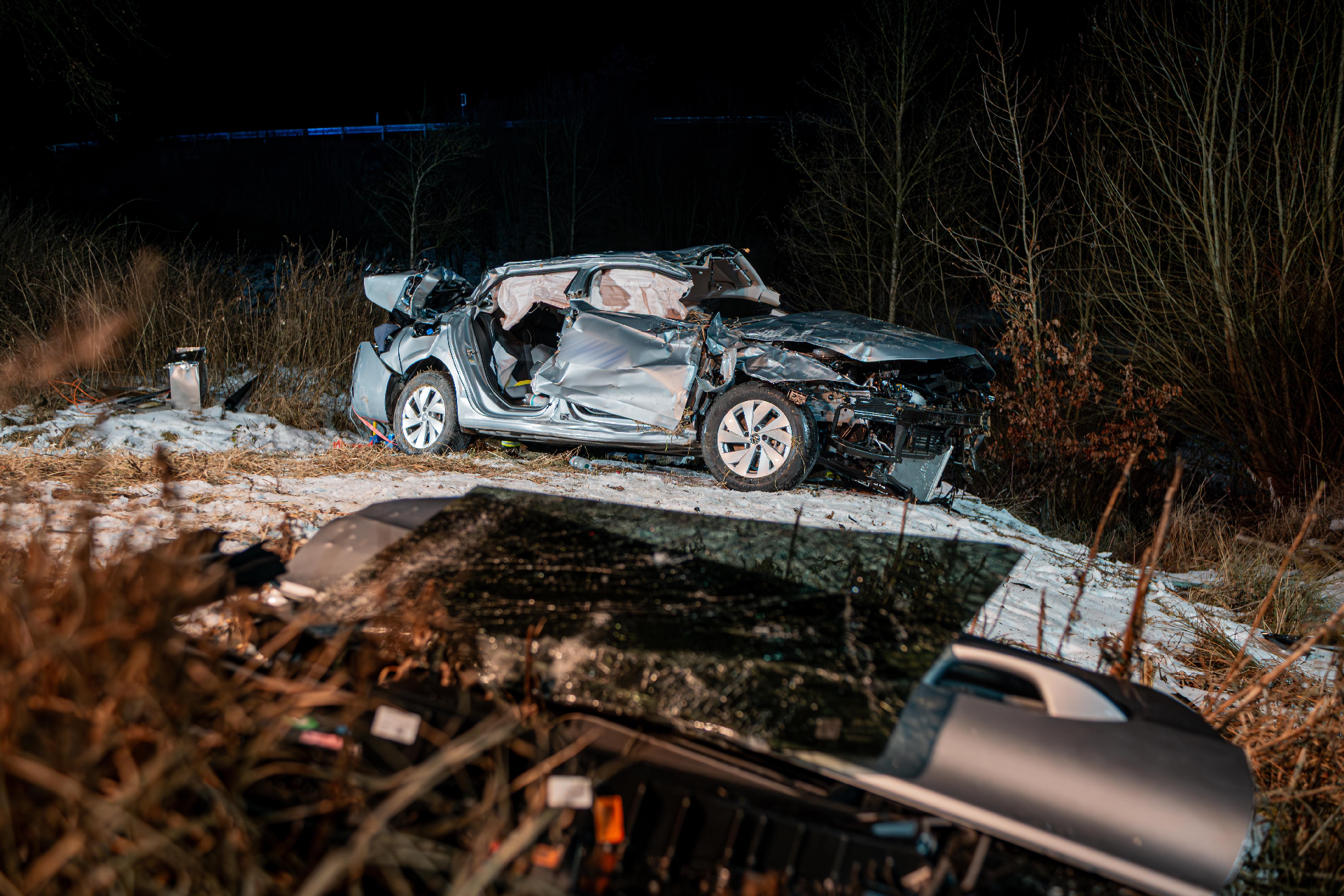 Eine zügige Erkundung unseres Führungsdienstgrads bestätigte die Situation. Ein alleinbeteiligtes Fahrzeug der Marke VW, kam aus bisher ungeklärter Ursache im Bereich der Überleitung auf die Bundesstraße 15 von der Fahrbahn ab, überschlug sich mehrfach im angrenzenden Grünbereich, hob über eine Leitplanke ab und überschlug sich bzw. rollte weiter hinab in ein rund 10 Meter tiefer gelegenes Regenrückhaltebecken, ehe es auf allen vier Reifen wieder zum Stehen kam.