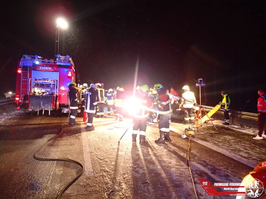 Gegen 20:20 Uhr wurden wir zur Unterstzützung der ILS Regensburg auf die A93 Fahrtrichtung München zu einem Verkehrsunfall mit eingeklemmter Person alarmiert. Als der Rüstzug unserer Wehr zusammen mit der ebenfalls mitalarmierten Feuerwehr Pentling an der Einsatzstelle eintrafen bot sich folgende Lage: Ein PKW der Marke Opel kam aus bisher ungeklärter Ursache ins Schleudern, krachte gegen die Mittelschutzleitplanke und kollidierte anschließend mit einem weiteren PKW. Der Fahrer des Unfallfahrzeugs wurde in seinem PKW eingeklemmt. Nach Rücksprache mit dem anwesenden Notarzt konnte jedoch eine patientenschonende Rettung vorgenommen werden. Während der Rettungsmaßnamen war die Autobahn komplett gesperrt. Zusammen mit dem Rettungsdienst konnte die schwerverletzte Person zügig mittels schwerem Rettungsgerät aus dem Wrack gerettet und anschließend mit dem Rettungswagen in ein Krankenhaus verbracht werden. Bis zum Eintreffen der Abschleppunternehmen übernahmen wir die Ausleuchtung der Unfallstelle, sowie die Verkehrsabsicherung, nachdem der Verkehr über die linke Spur vorbeigeleitet wurde. Nach zweieinhalb Stunden konnten alle Kräfte wieder einrücken.