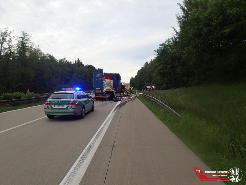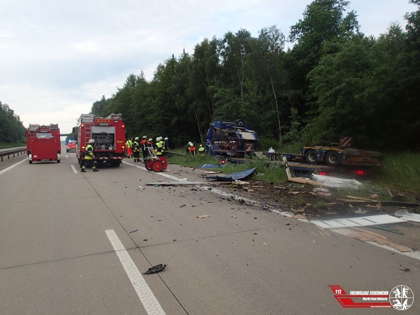Ein Tieflader-Sattelzug kollidierte aus bisher ungeklärter Ursache mit einem auf dem rechten Fahrstreifen befindlichen Gliederzug. Durch die Wucht des Aufpralls wurde der Anhänger des Gliederzugs völlig zerissen. Der Sattelzug kam schwer beschädigt im neben der Autobahn angrenzenden Grünstreifen demoliert zum Stehen. Nach Ankunft an der Einsatzstelle, wurde unser Hilfeleistungslöschfahrzeug [HLF] aufgrund der bereits durch die Feuerwehr Pentling durchgeführten Personenrettung nicht mehr benötigt.