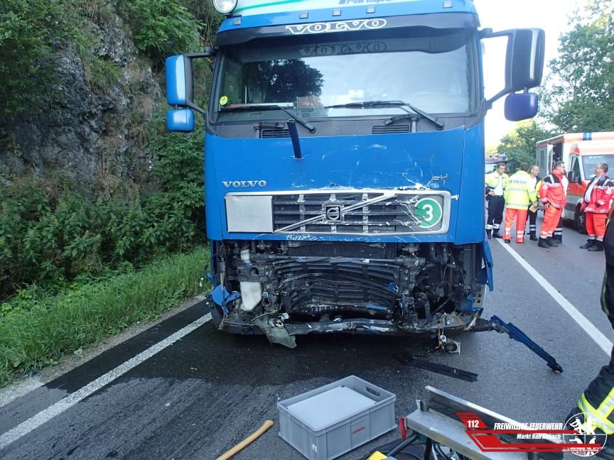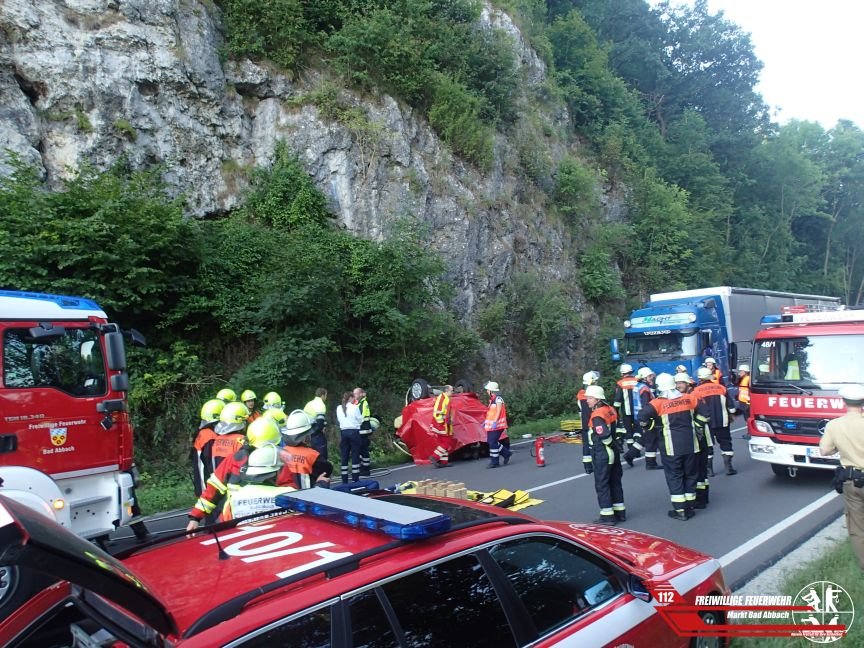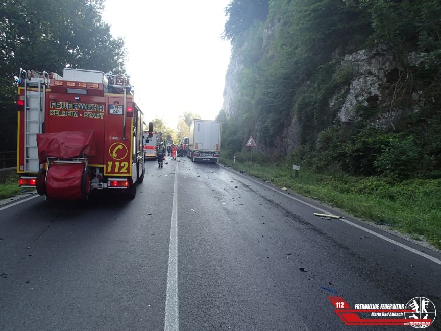 Zu einem schweren Verkehrsunfall mit eingeklemmter Person wurden wir gemeinsam mit den Feuerwehren Lengfeld und Kelheim-Stadt gegen 08:00 Uhr am Freitagmorgen auf die Bundesstraße B16 alarmiert. Aus bislang unbekannter Ursache ist ein PKW der Marke Fiat frontal mit einem entgegenkommenden LKW kollidiert. Der Fahrer des Kleinwagens wurde so schwer eingeklemmt, dass er noch an der Unfallstelle seinen schweren Verletzungen erlag. Durch die Staatsanwaltschaft wurde ein Sachverständiger zum Erstellen eines unfallanalytischen Gutachtens hinzugezogen. Die Bundesstraße B16 war zwischen den Anschlussstellen Bad Abbach-Süd und Lengfeld für rund fünf Stunden komplett gesperrt.