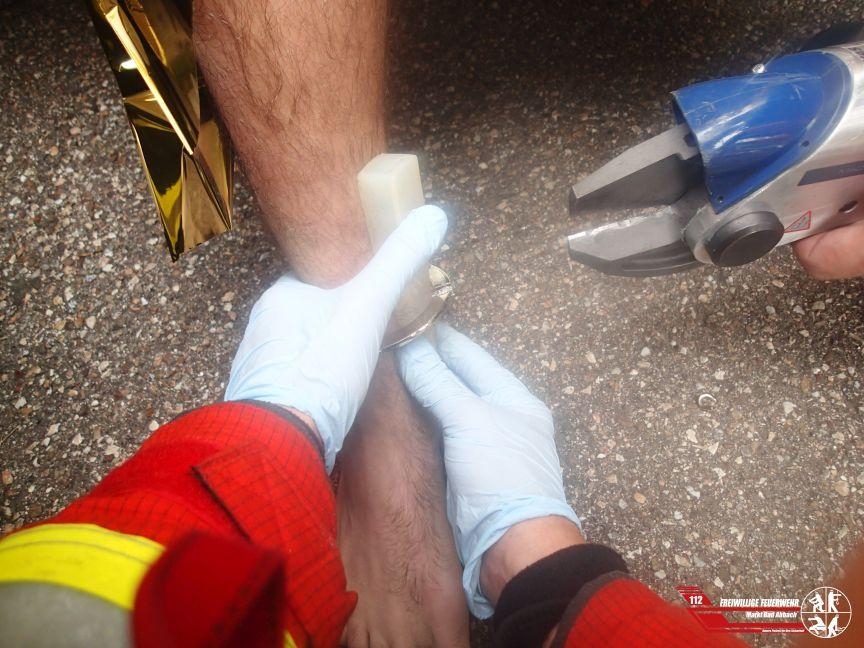 Am heutigen Nachmittag wurden wir zur Unterstützung des Rettungsdienstes in die Oberndorferstraße alarmiert. Eine von Passanten am Donauufer aufgefundene Person musste von Fußfesseln befreit werden. Dies war weder dem Rettungsdienst, noch der anwesenden Polizeistreife möglich. Somit wurde unsererseits ein Bolzenschneider und hydraulisches Schneidgerät eingesetzt, um den Patienten aus der misslichen Lage zu befreien. Er wurde daraufhin in ein nahegelegenes Krankenhaus verbracht.