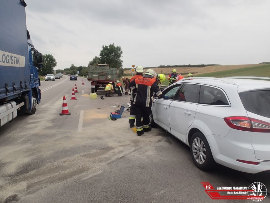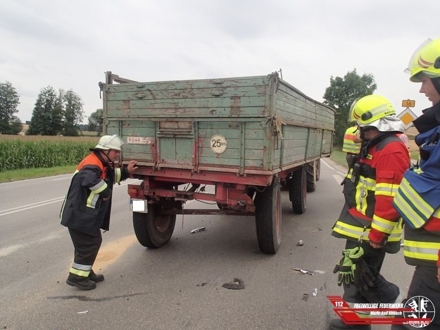 Um 16:55 Uhr wurden wir zu einem Verkehrsunfall mit einem Pkw und einem Traktor auf die Bundesstraße B16 alarmiert. Aufgrund eines Fahrfehlers krachte ein Personenwagen der Marke Ford frontal in das Heck eines Traktor-Anhängergespanns. Zunächst wurden die ausgelaufenen Betriebsstoffe gebunden und die Unfallstelle abgesichert. Um den fahruntüchtigen Anhänger zu Bergen, mussten bei strömenden Regen mehrere Tonnen Getreide auf einen anderen Hänger umgeschaufelt werden. Der Fahrer des Pkw wurde mit Verletzungen in ein Krankenhaus verbracht. Der Lenker des Traktors kam ohne Verletzungen davon.