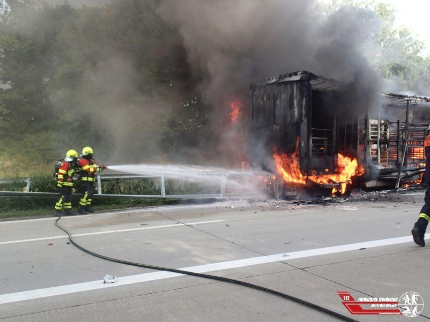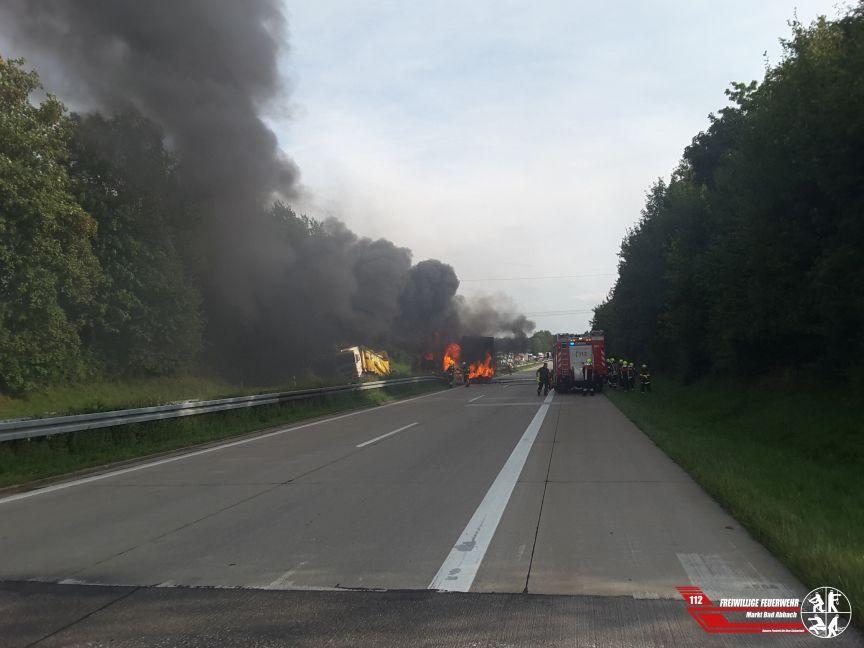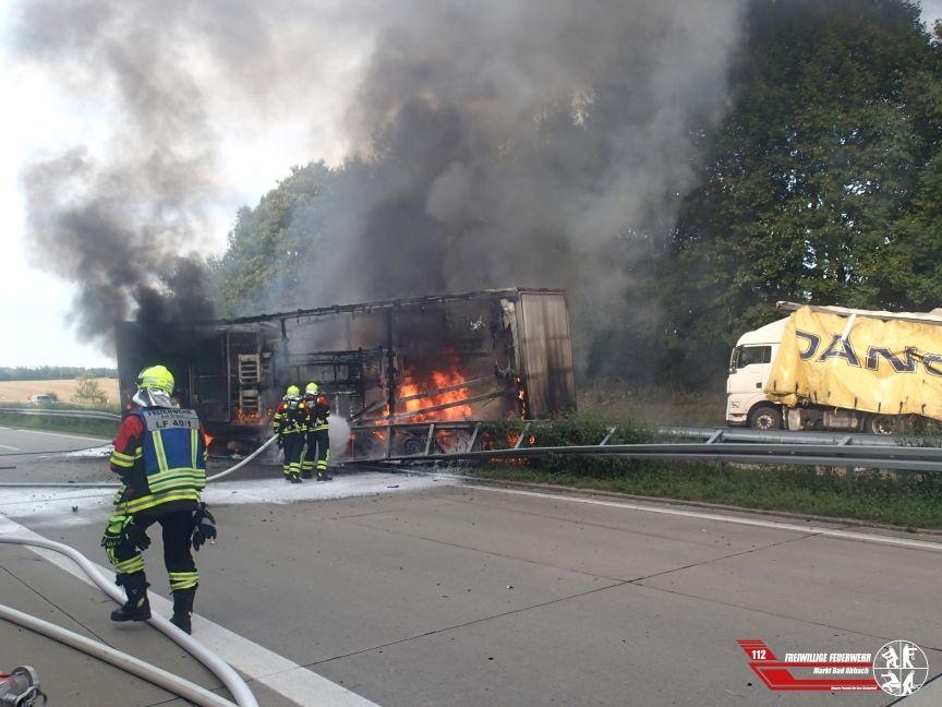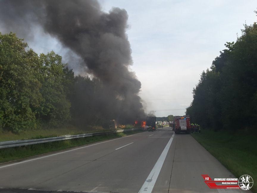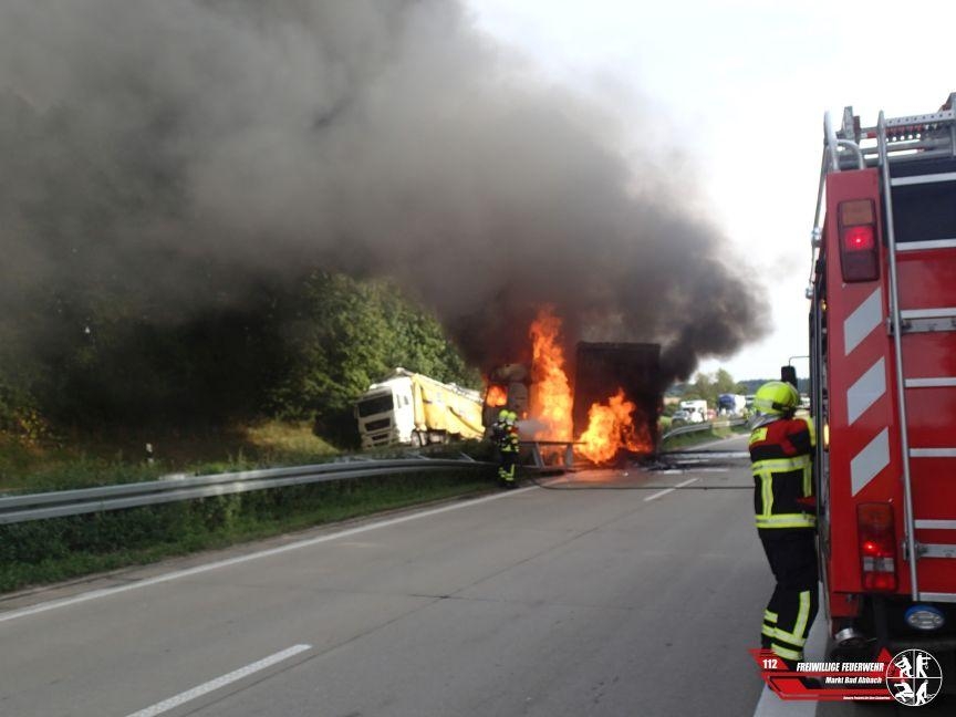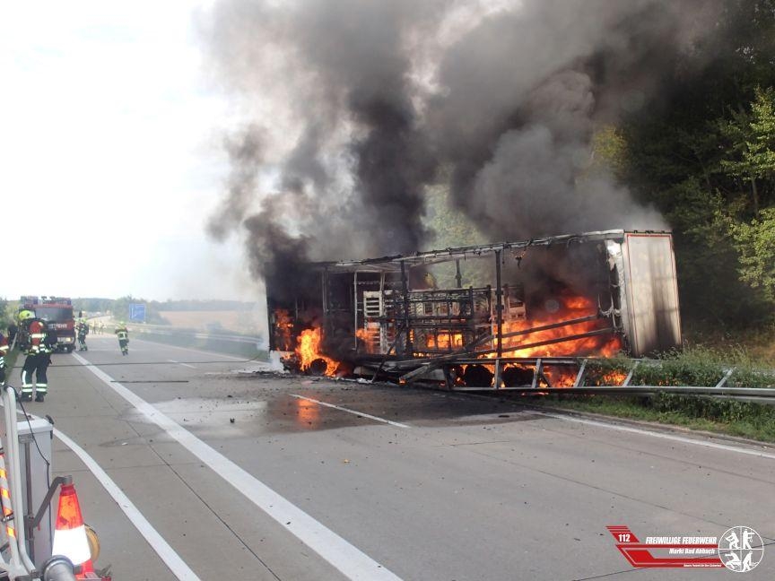 Bei Eintreffen unserer Einsatzleitung brannte der in der Mittelleitplanke befindliche Lkw bereits in voller Ausdehnung. Der zweitbeteiligte Sattelzug stand in Fahrtrichtung Regensburg rechtsseitig demoliert im Bankett. Nachdem eine sofortige Vollsperre und Sicherungsmaßnahmen der Autobahn ausgeführt waren, wurde umgehend durch unseren Löschzug, unterstützt durch weitere Wehren, ein massiver Wasser-Schaumeinsatz begonnen, um den Flammen Herr zu werden.