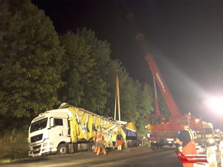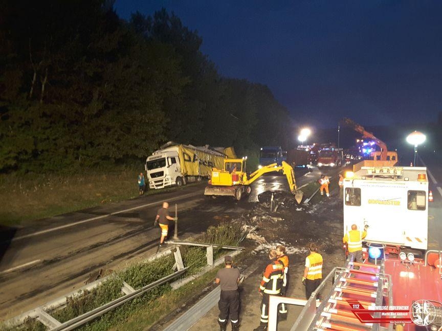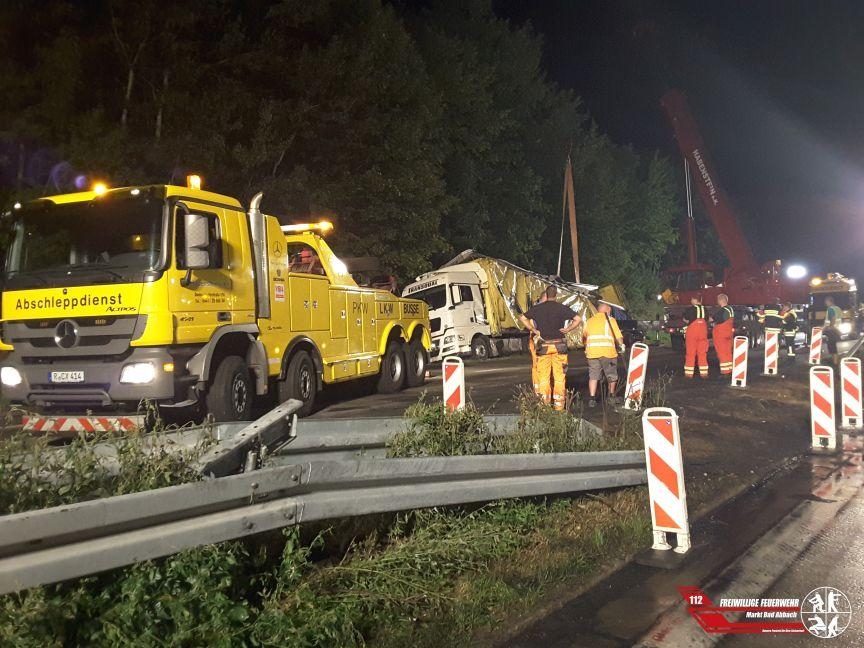 Die Bergungsmaßnahmen der beiden nicht mehr fahrtüchtigen Sattelzüge zogen sich bis nach Mitternacht hin. Die Autobahn 93 war teils komplett, teils halbseitig gesperrt.