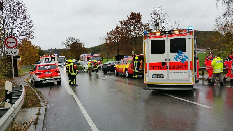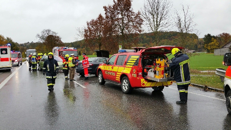 Gegen 11 Uhr wurden wir zusammen mit Kräften der Ortsteilwehr Lengfeld, Teugn und der Feuerwehr Kelheim-Stadt zu einem Verkehrsunfall mit mehreren Pkw auf die Bundesstraße 16, höhe dem Industriegebiet alarmiert. Zwei Pkw kollidierten aus bisher ungeklärter Ursache im Frontbereich miteinander. Eine Person wurde im Fahrzeug eingeschlossen und musste ohne technisches Gerät gerettet werden. Weitere Personen, darunter mehrere Kleinkinder kamen mit leichten bis keinen Verletzungen in nahegelegene Krankenhäuser.